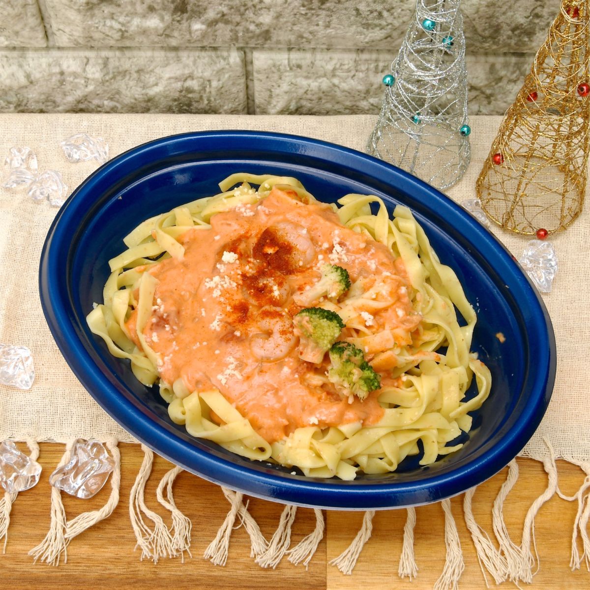 むき海老とブロッコリーがトッピングされたトマト風味が濃厚に際立つクリームソース。