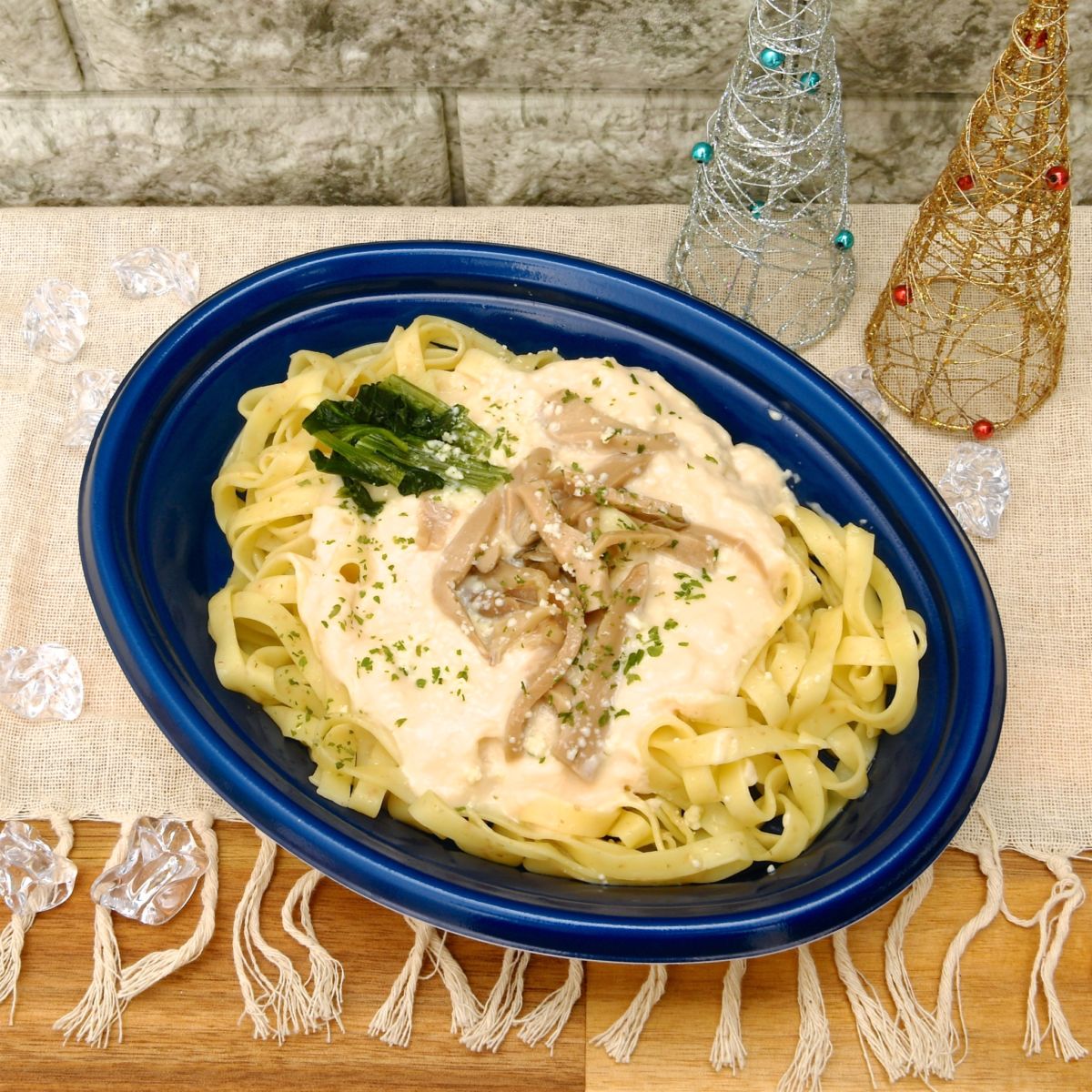 3種類のきのこのトッピングと降り積もる雪をイメージしたクリームソース。