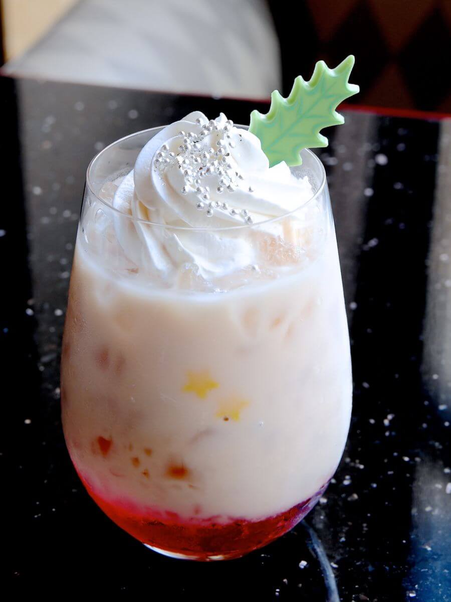 東京ディズニーランド”ディズニー・クリスマス2019”スペシャルドリンクはミルク、アイスティー、ピーチジュース、ストロベリーシロップ、フランボワーズシロップ入りのデザートドリンク。