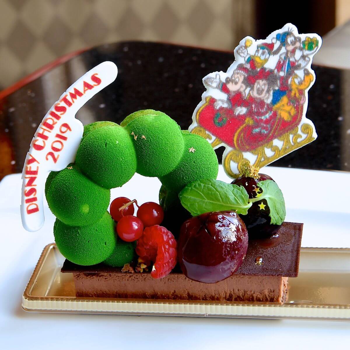 東京ディズニーランド”ディズニー・クリスマス2019”スペシャルケーキは「チョコレートとピスタチオのムース」とお飲み物のセット。