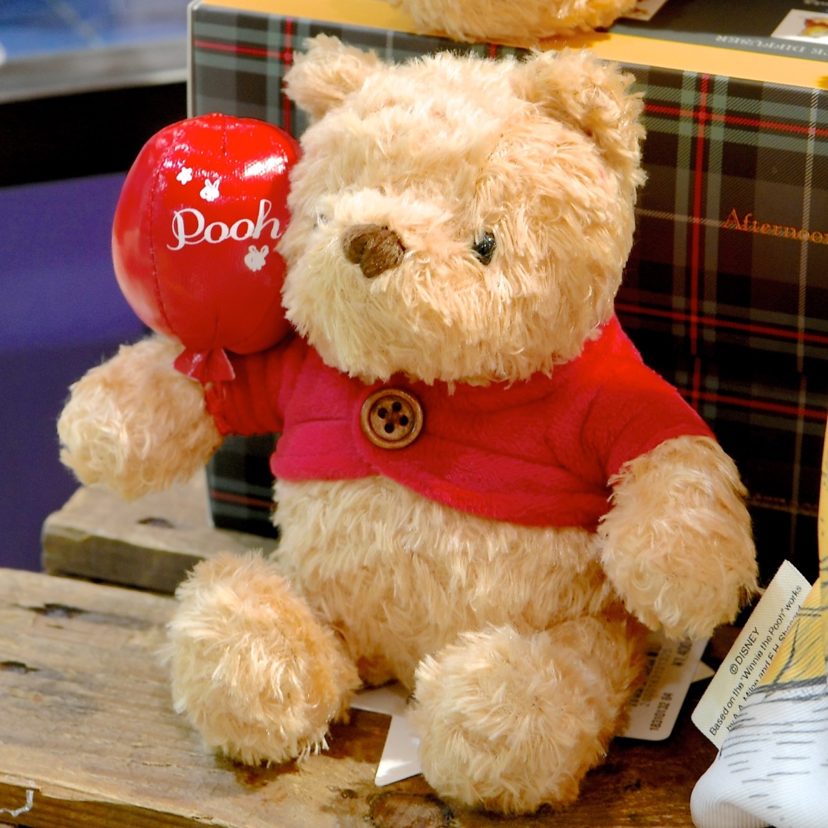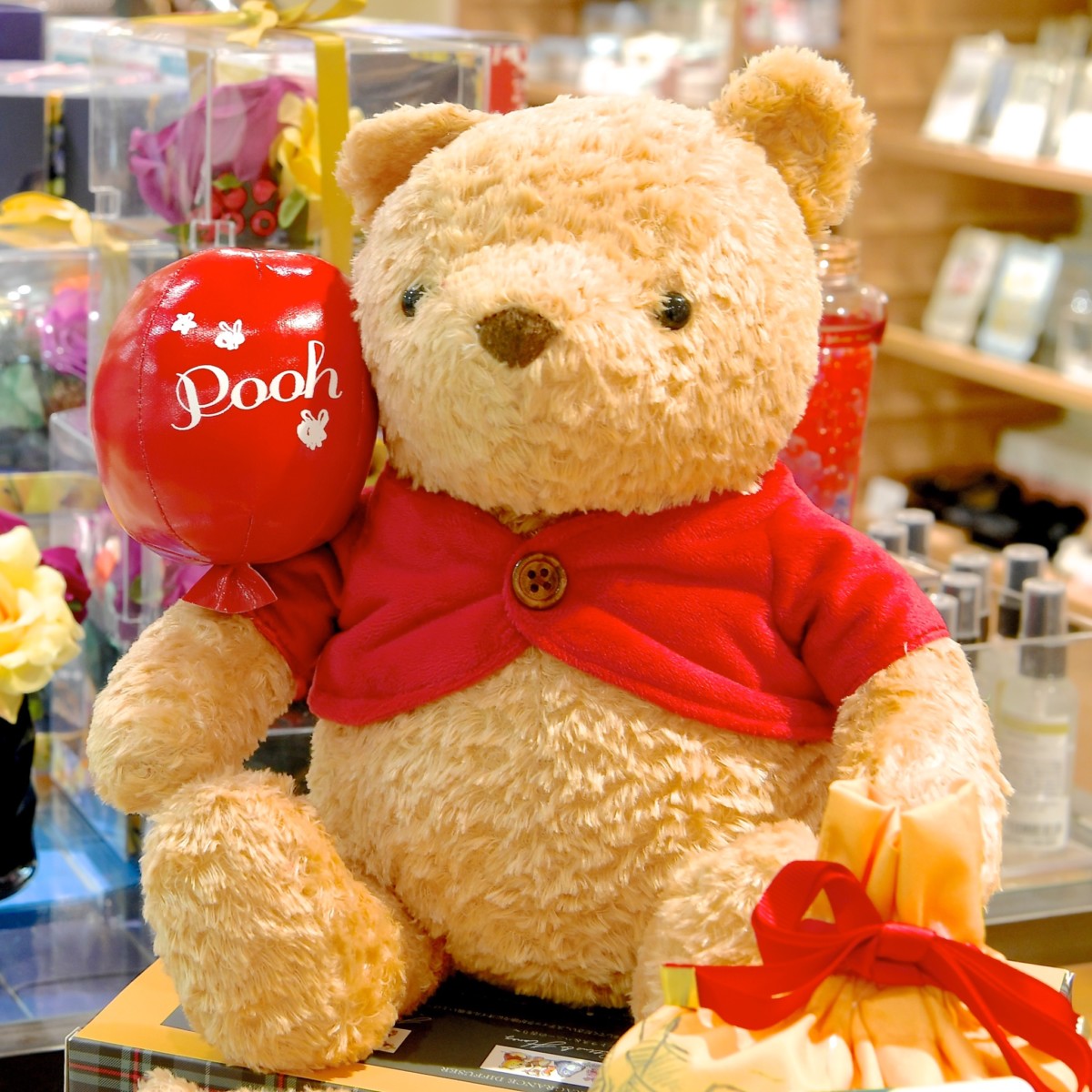 赤い風船を持ったふわふわかわいいプーさんのぬいぐるみ。