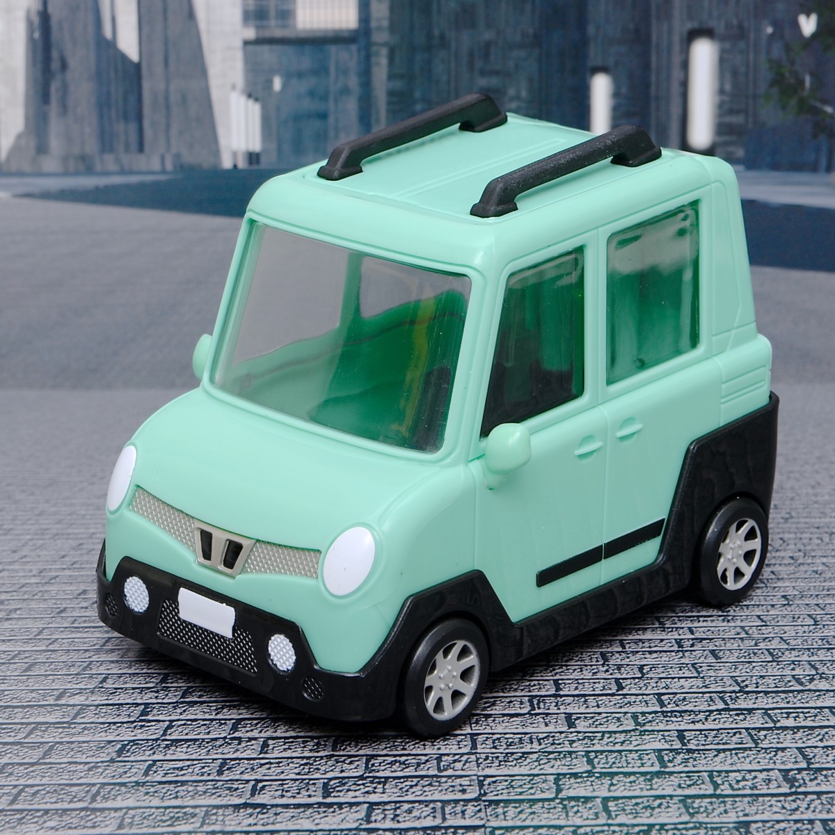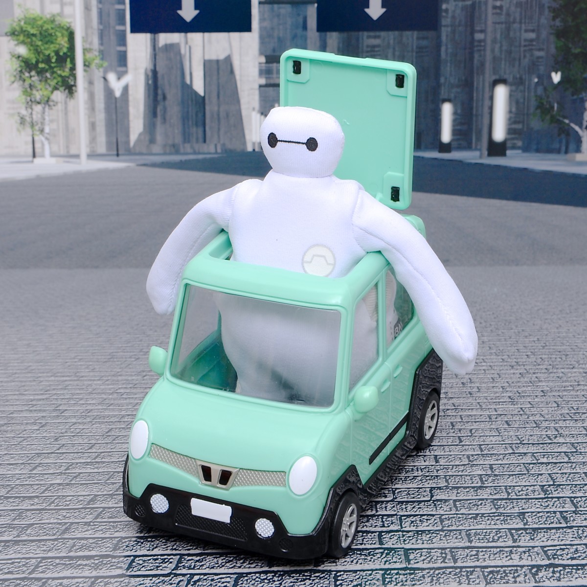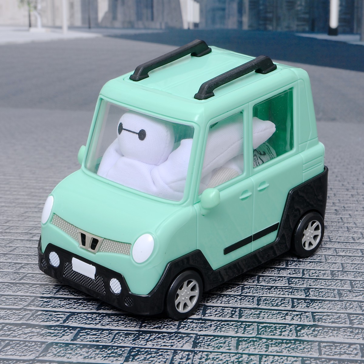 やわらか素材の「ベイマックス」は、「ワサビの車」にぎゅうぎゅうにつめて、乗車させることも可能です。