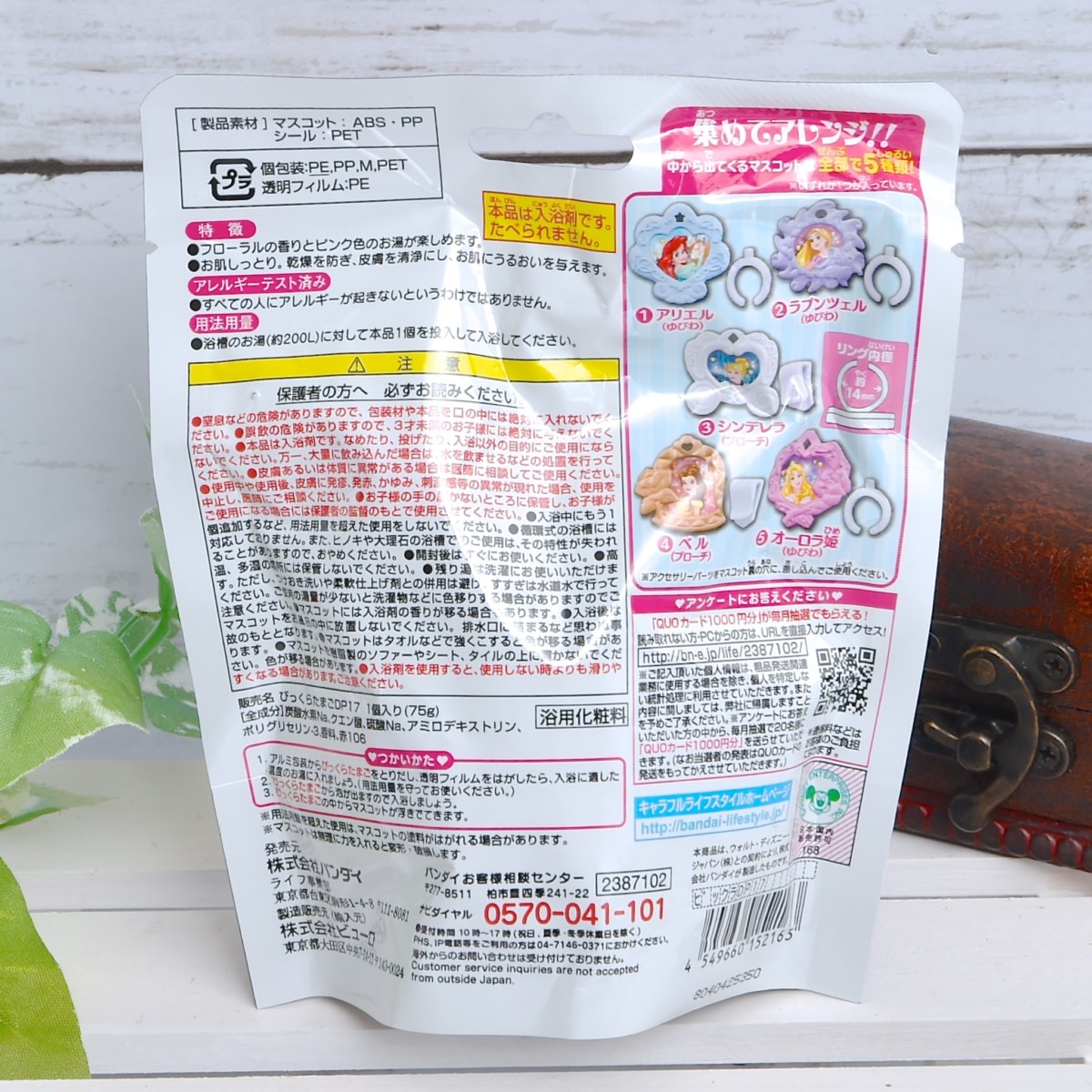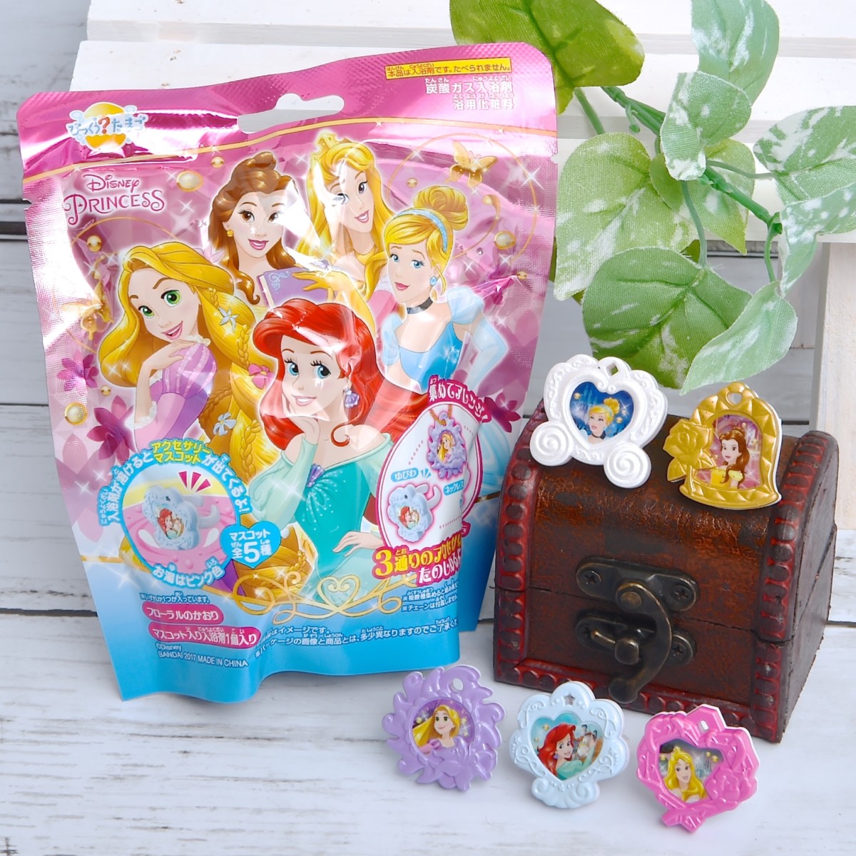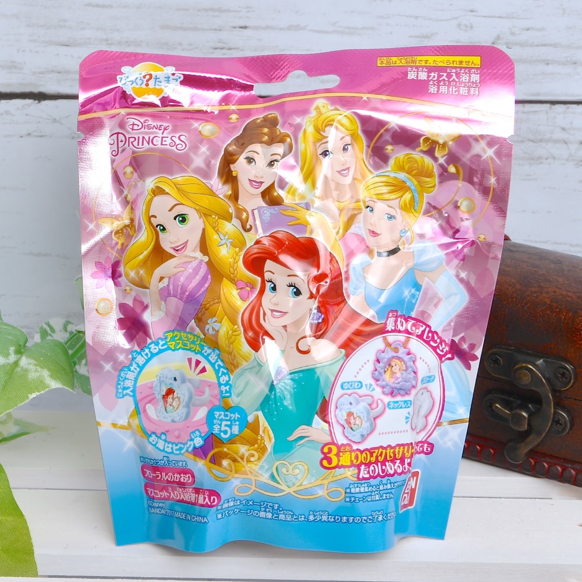 入浴剤が溶けると、中からアクセサリーとしても使える「ディズニープリンセス」モチーフのマスコットが1つ出てきます。