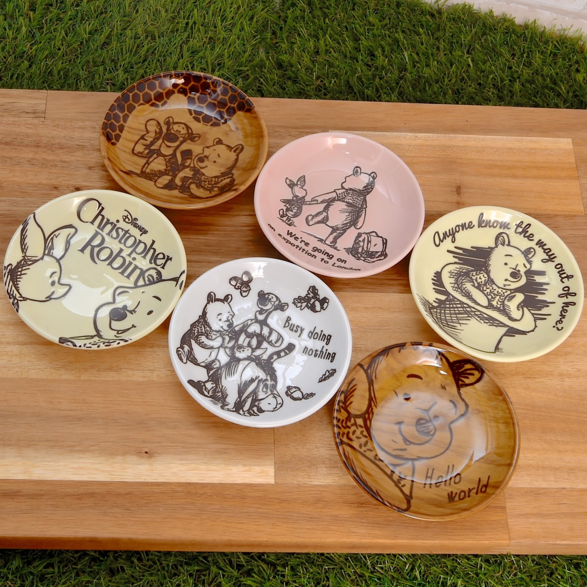 木目のプリントが入った飴色のお皿が2種、ピンクと黄色のパステルカラーのお皿、プレーンな白のプーさんと仲間たちがデザインされたお皿と、どれも魅力的!