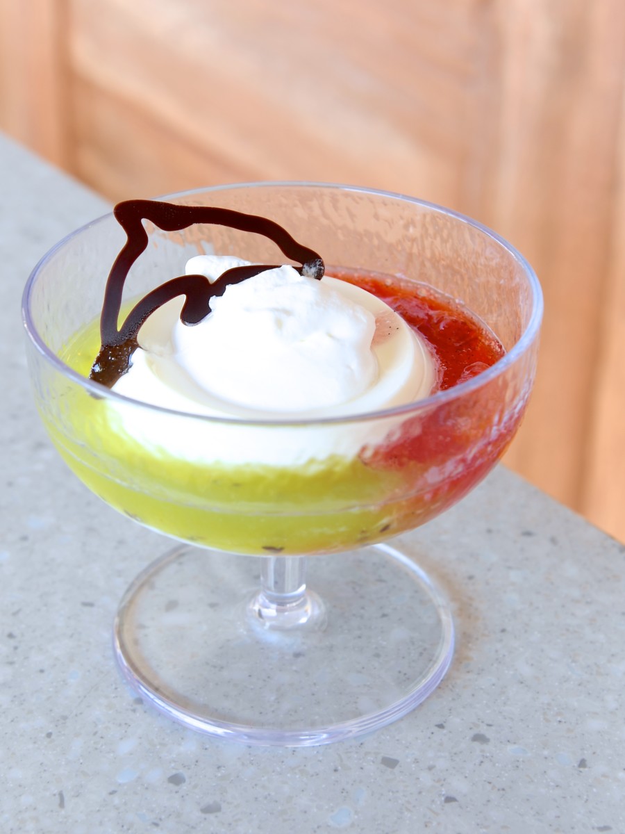 キウイソースとベリーソース、生クリームに加え、かわいいイルカ型のチョコレートがトッピングされたまろやかなパンナコッタ。