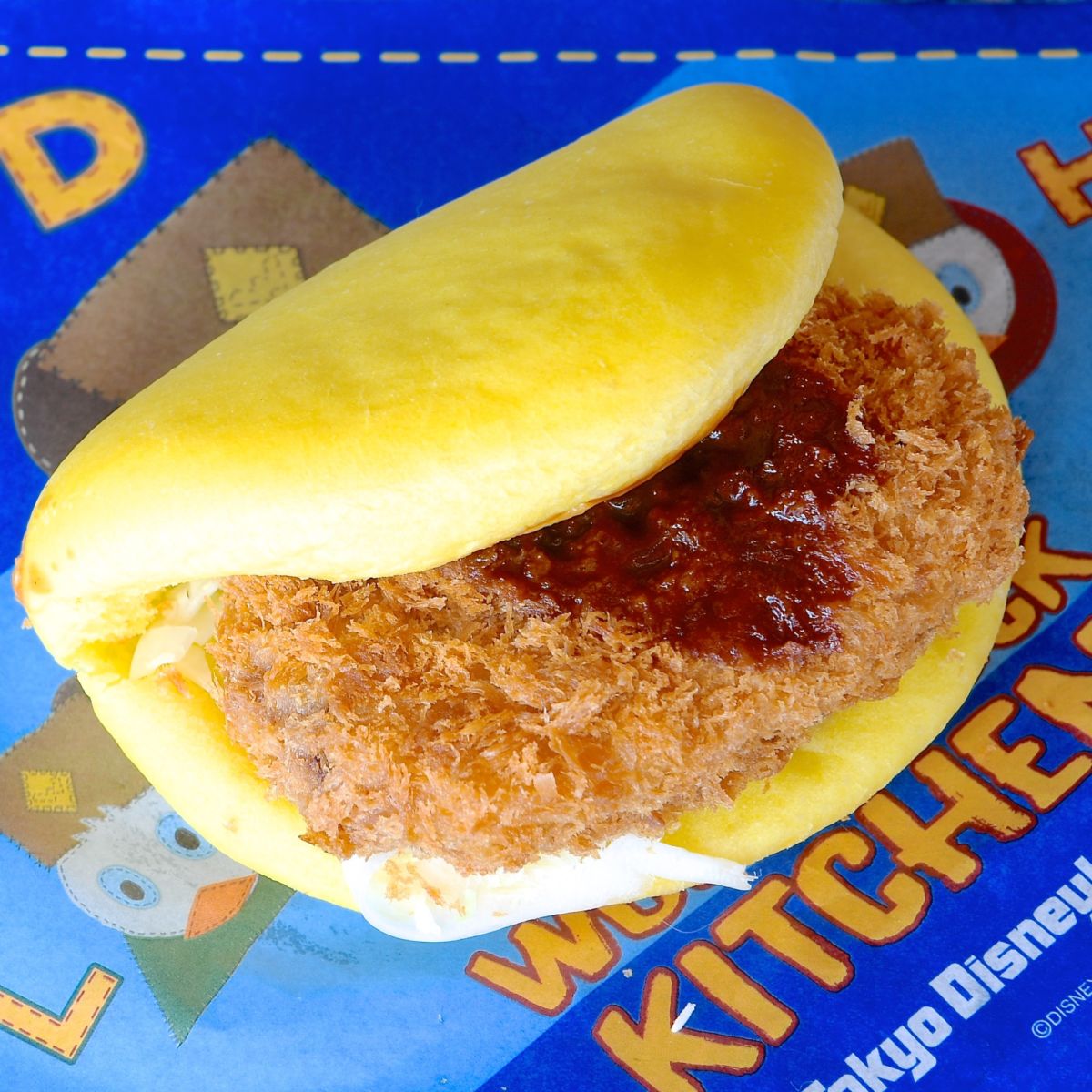 ドナルドダックのくちばしのような黄色いふんわりパンズにサクサクジューシーなメンチカツがサンドされたメンチカツサンド。