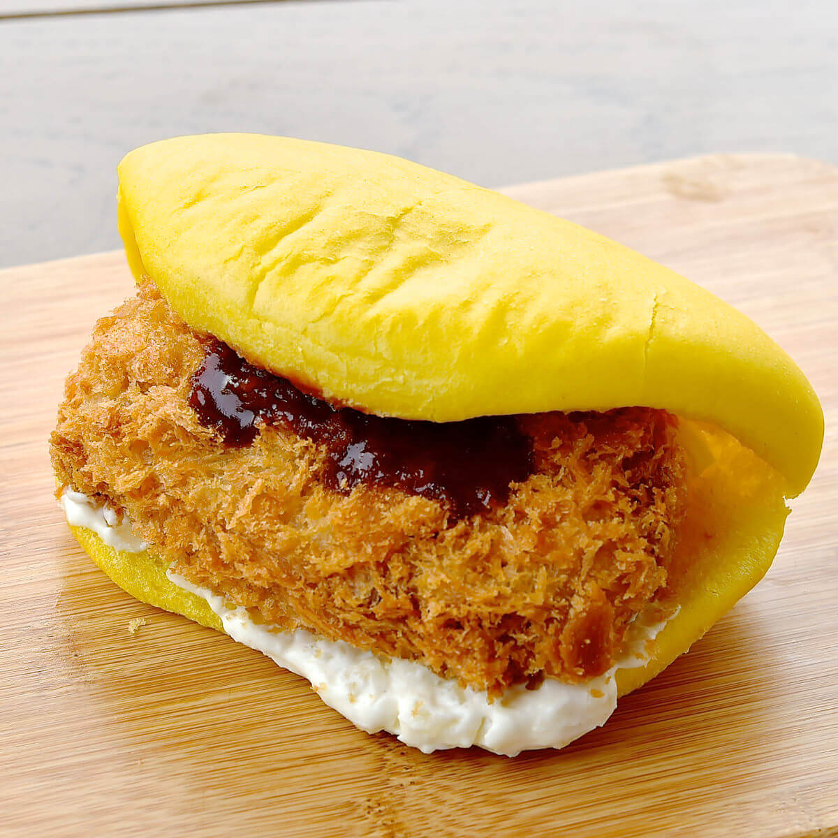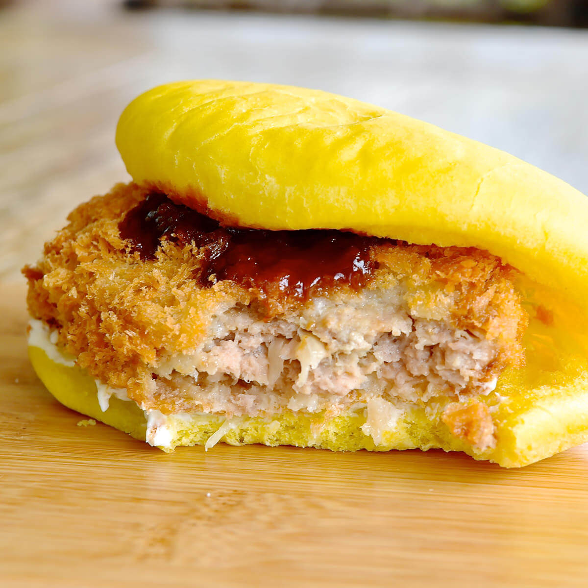 サクサクのメンチカツがドナルドのくちばしのような黄色いパンズにサンドされています。