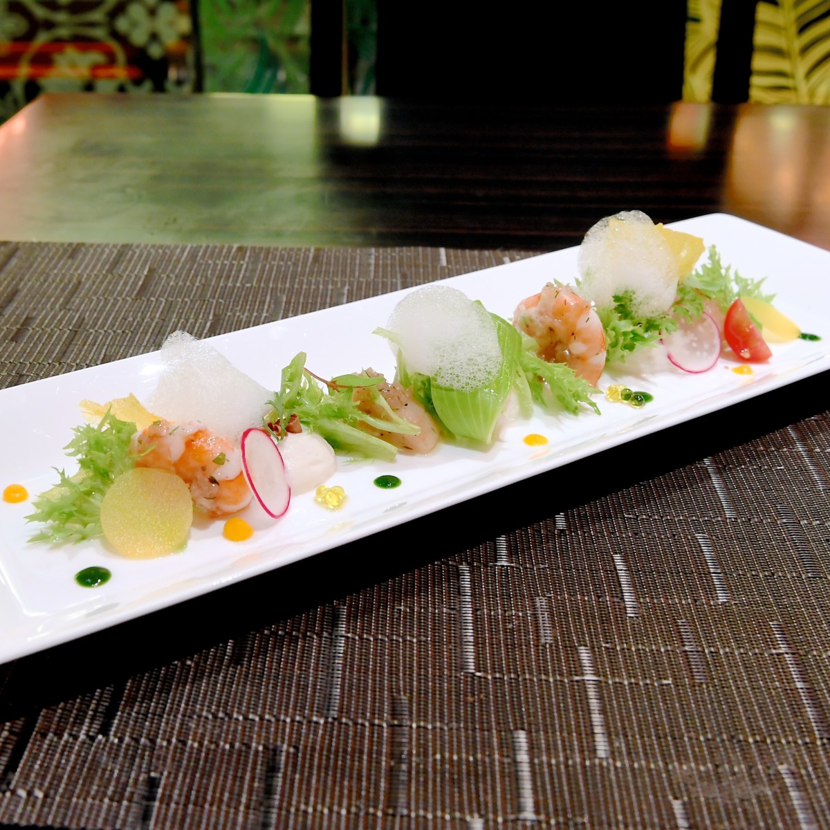 春らしく彩りも美しい前菜は天使の海老と帆立のグリルマリネ。