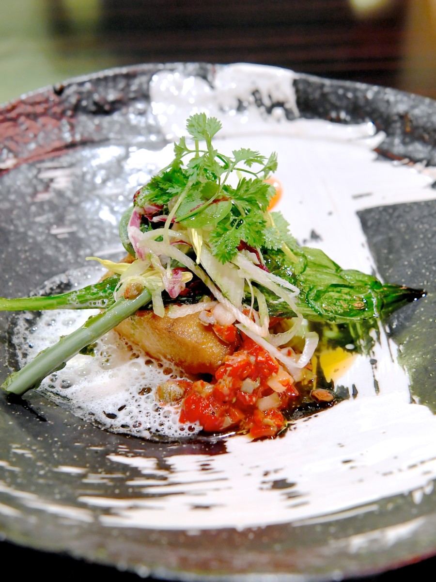 - 車麩の衣を纏った鰆のポワレ キャベツと塩麹のブレゼ 木の芽のピュレを添えて