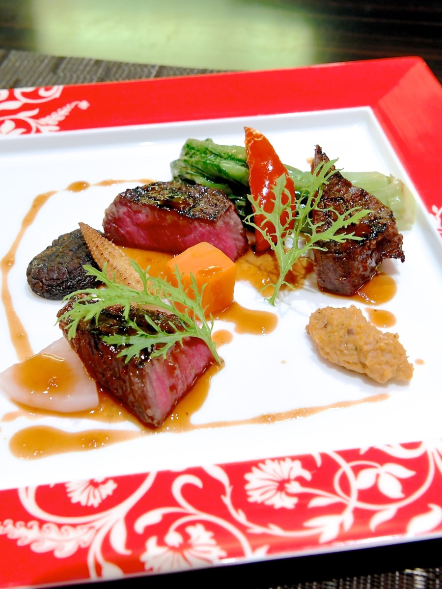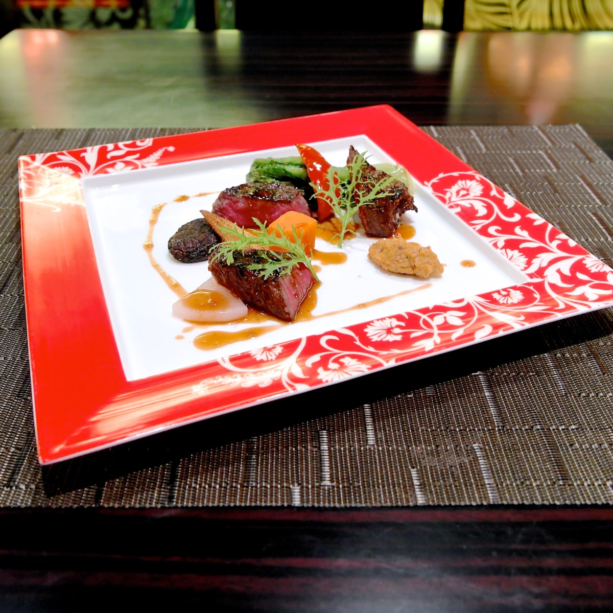- 胡麻油でマリネした牛ランプ肉のグリル サラダ菜のソテーと筍とコチュジャンのディップ