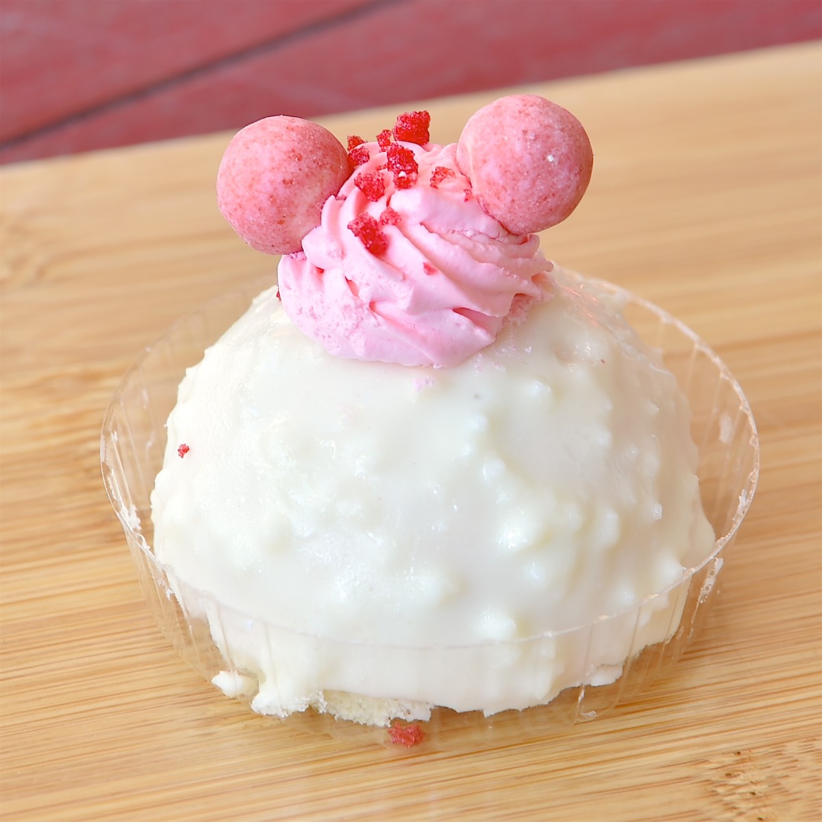 ストロベリームースケーキは、ホワイトチョコでコーティングされたドーム型のケーキ。