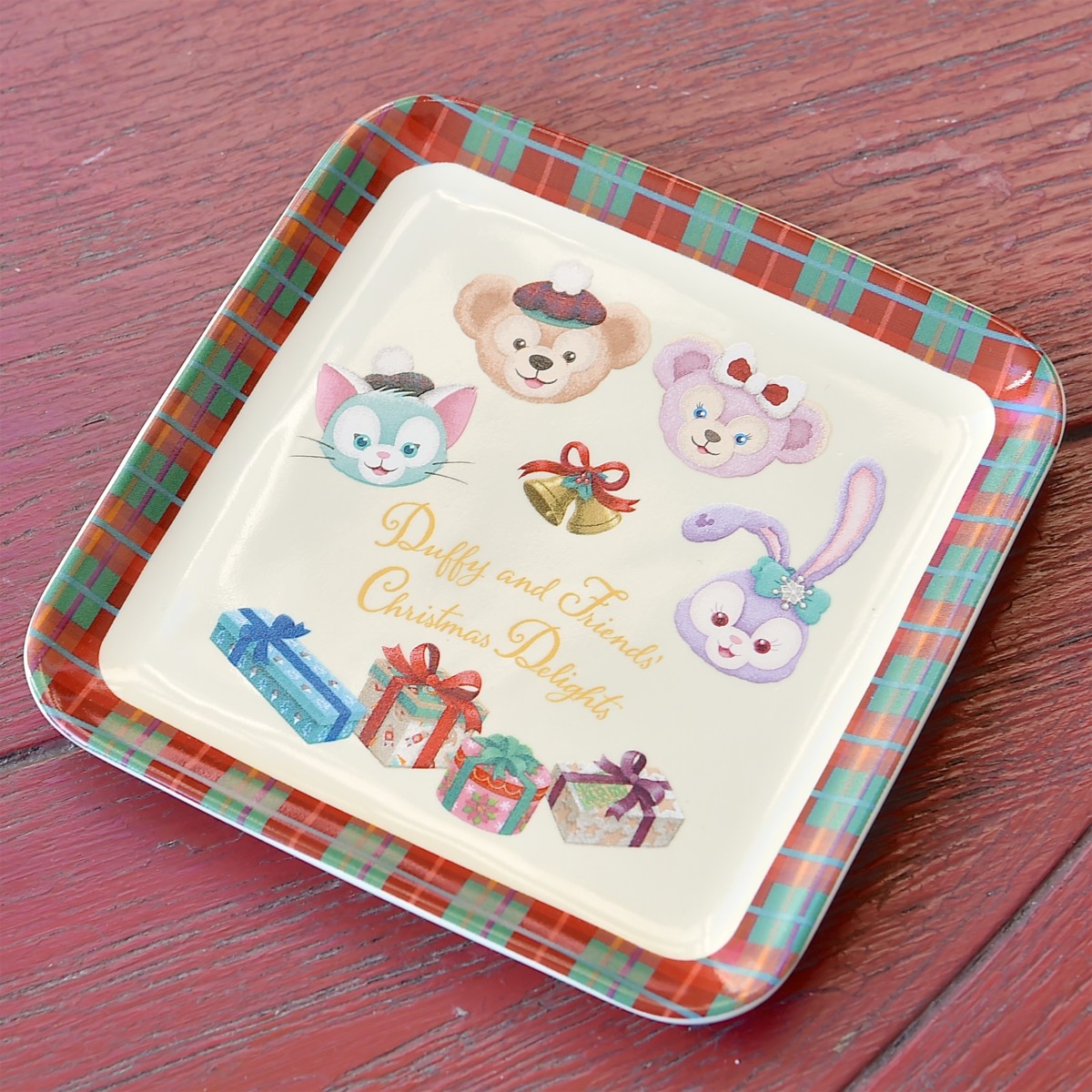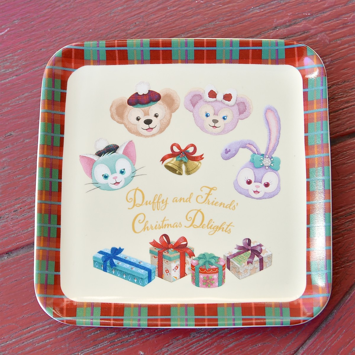 スクエア型のスーベニアプレートにはダッフィーたちのお顔と、それぞれのクリスマスプレゼントのボックスがデザインされています。