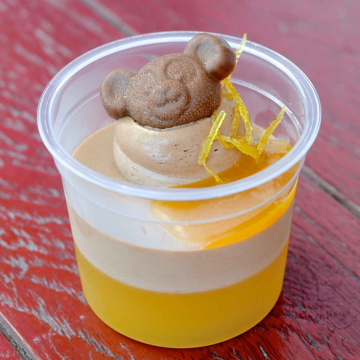 ダッフィーカラーの茶色いミルクチョコムースに黄色いシトラス・パッションフルーツゼリー。