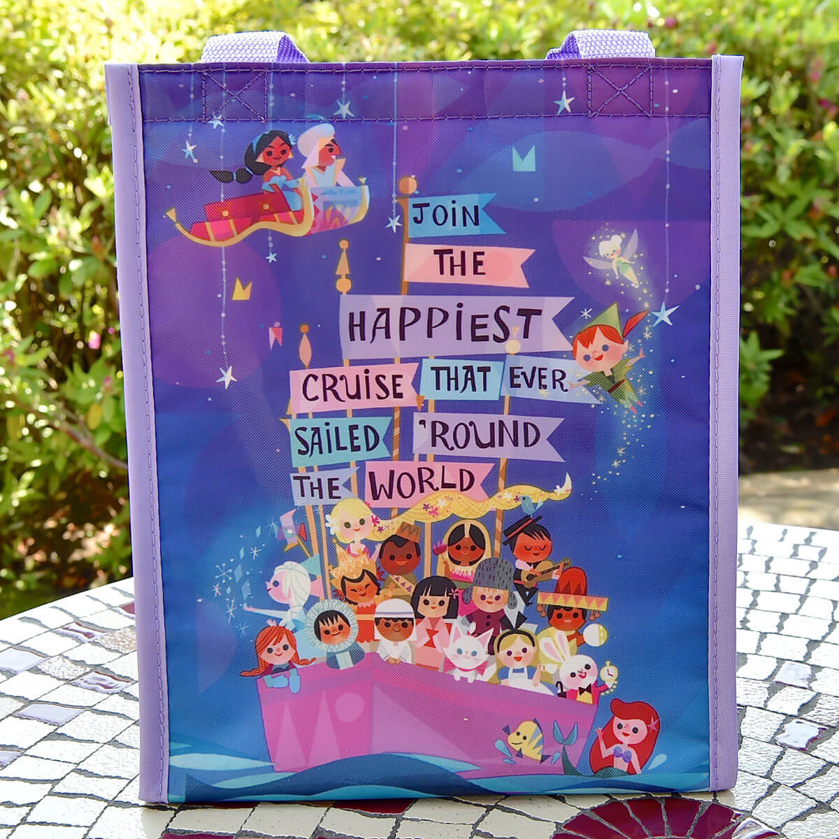 「イッツ・ア・スモールワールド」に登場するディズニーキャラクター達がデザインされた大きめサイズのスーベニアランチケースです。