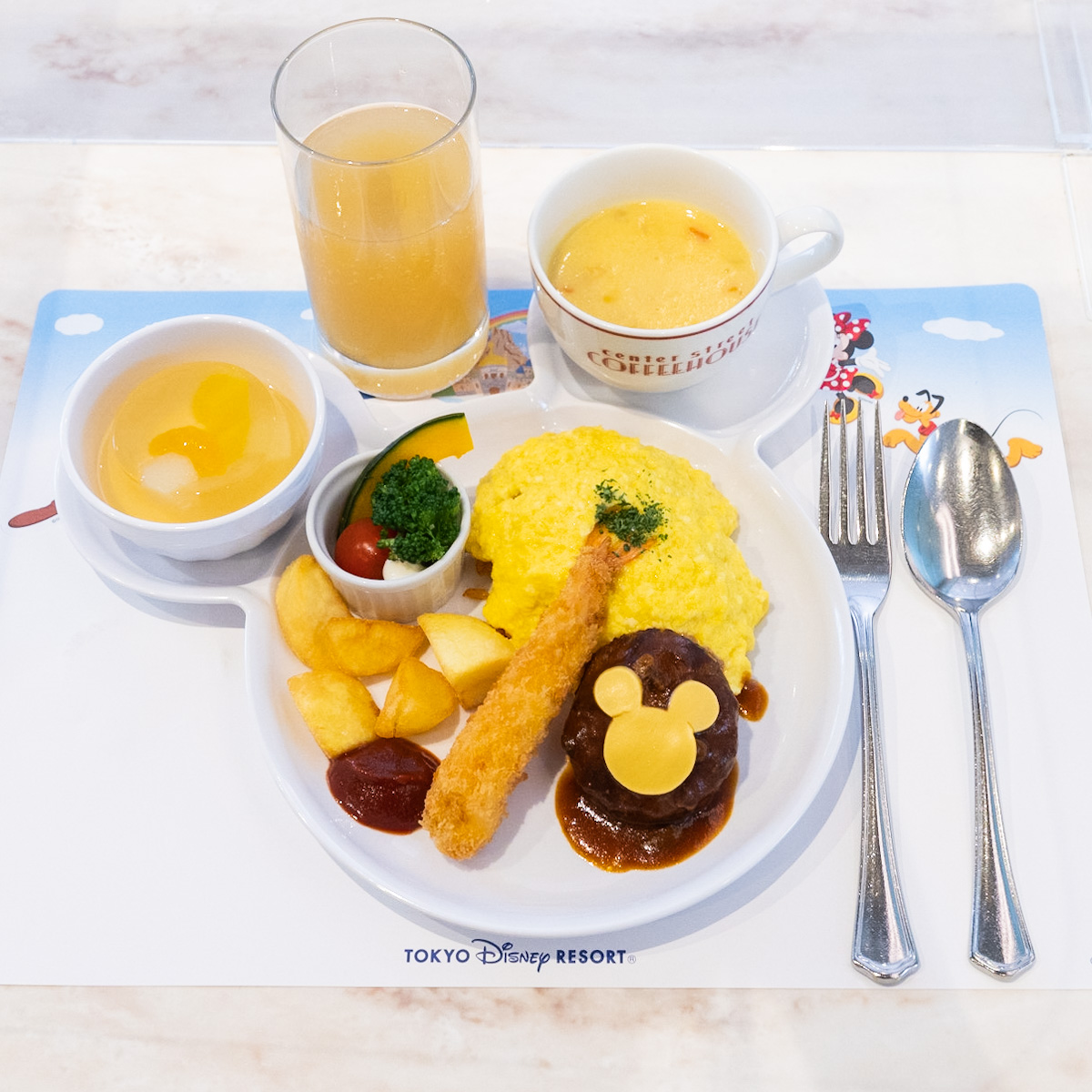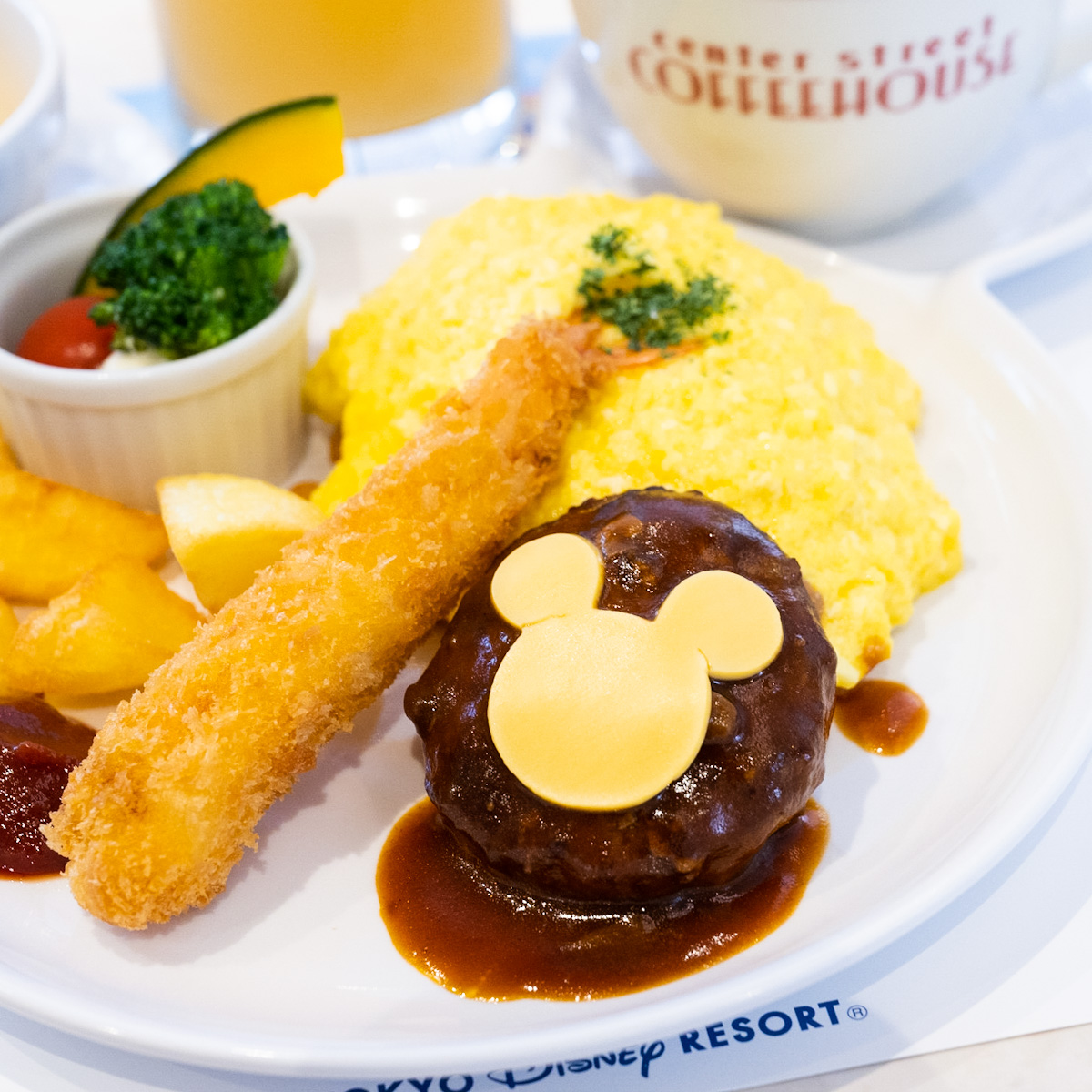 ミッキーシェイプのチーズがトッピングされたハンバーグと海老フライ、オムライス、コーンチャウダー、ミッキーマークがかわいいフルーツゼリー(2023年10月1日〜)などがワンプレートでいただけます。