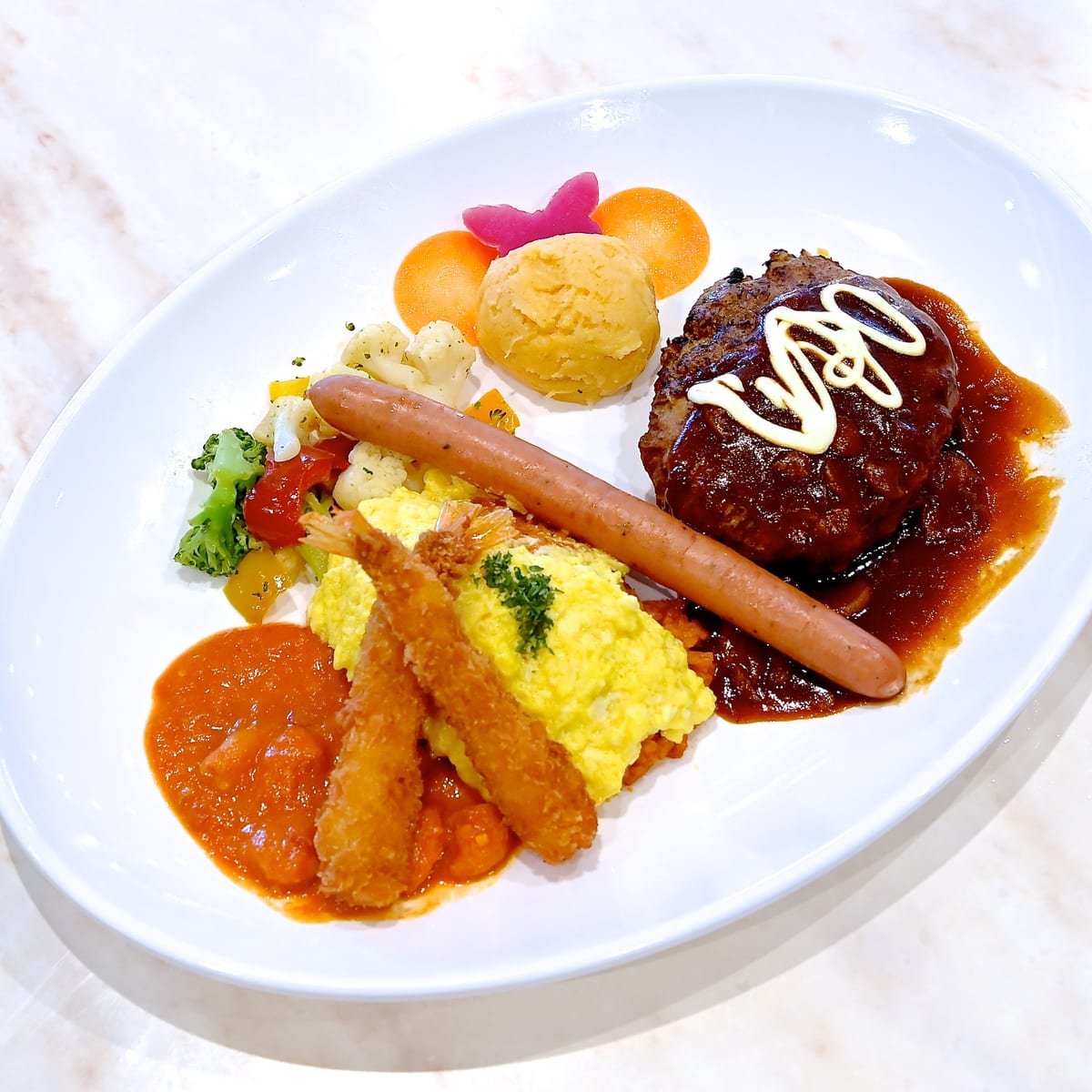 海老フライ、オムライス&海老トマトソース、チョリソー、温野菜、