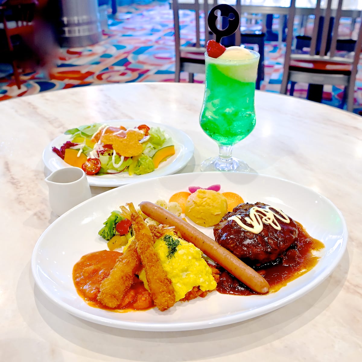 ミッキープレートには、ミートボール、海老フライ、ハッシュドポテト、ケチャップおにぎり、温野菜、フルーツゼリーまたはプリン、アップルジュース付きです。