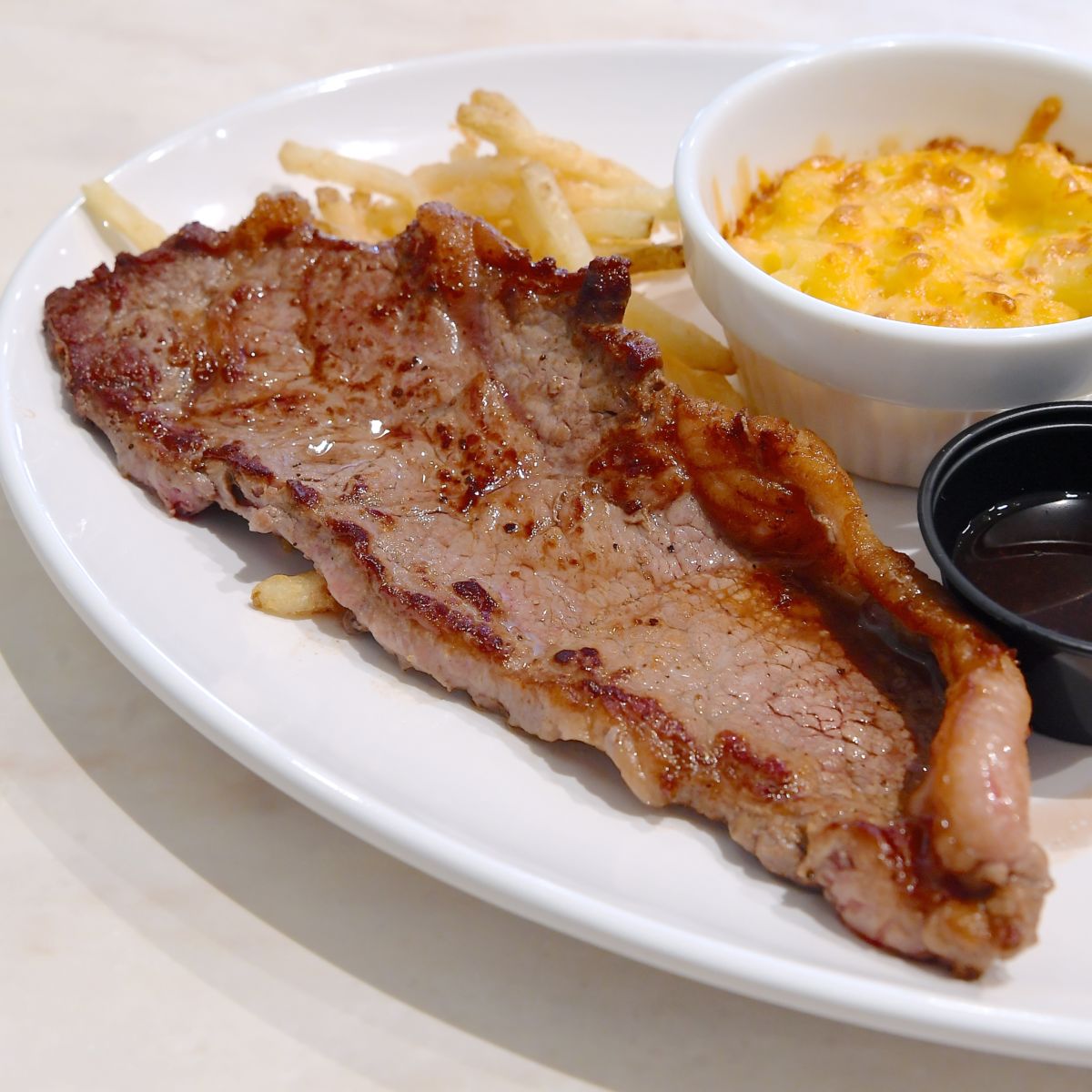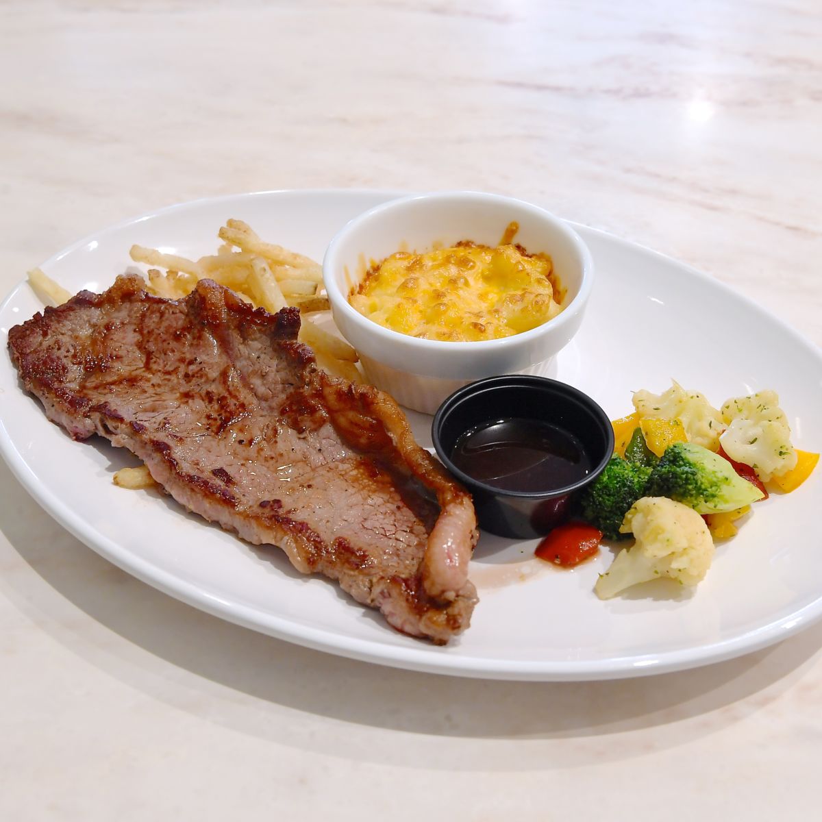 サーロインステーキ 和風ソース、マカロニ&チーズグラタンがワンプレートで提供されるコンビプレート。