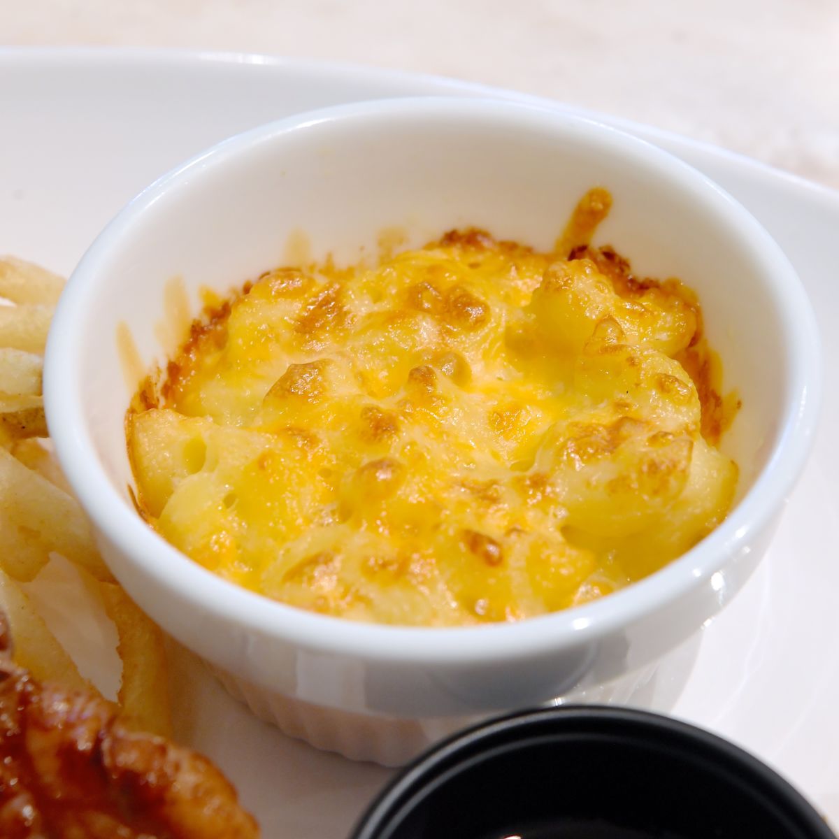 マカロニ&チーズグラタンとスチームベジタブルが添えられています。