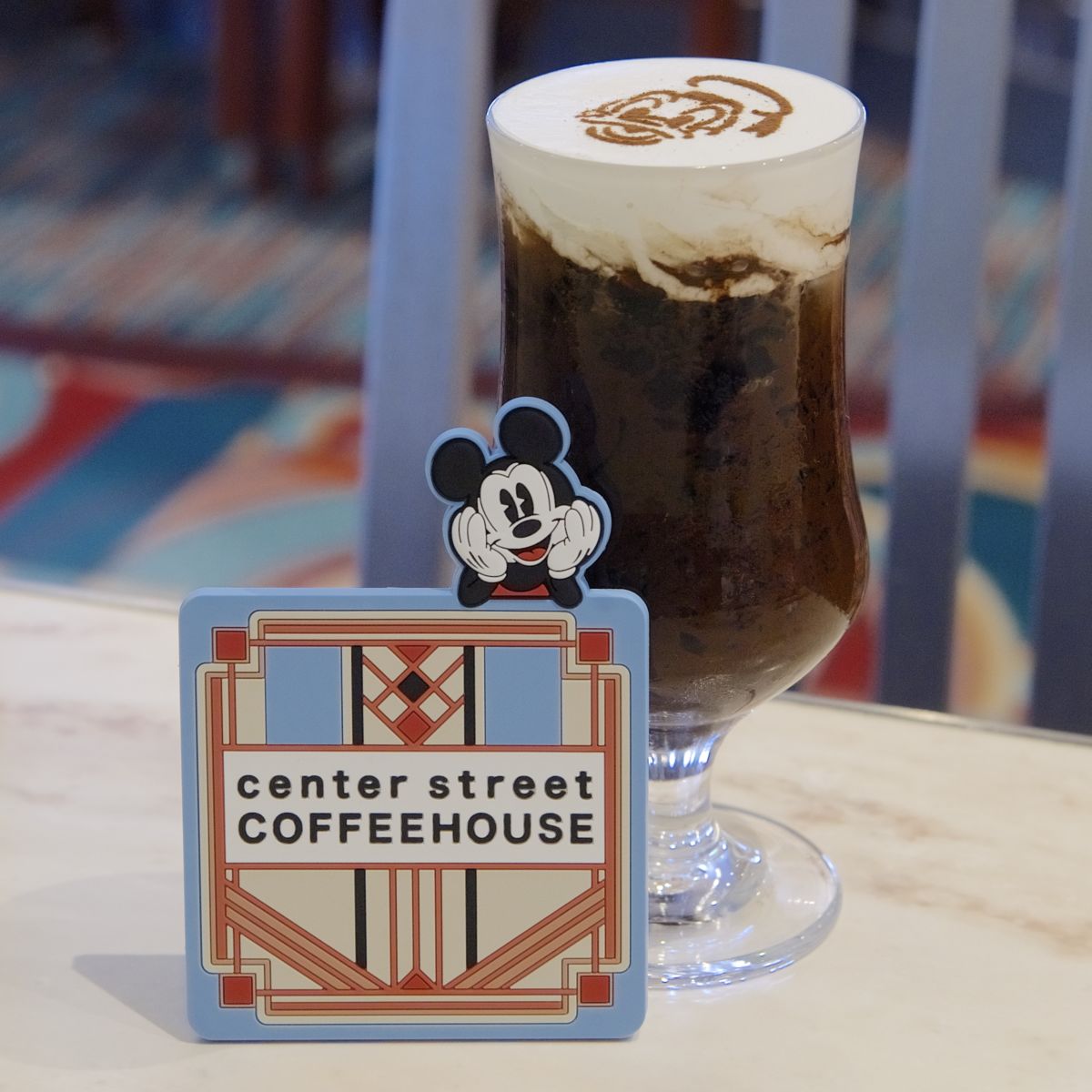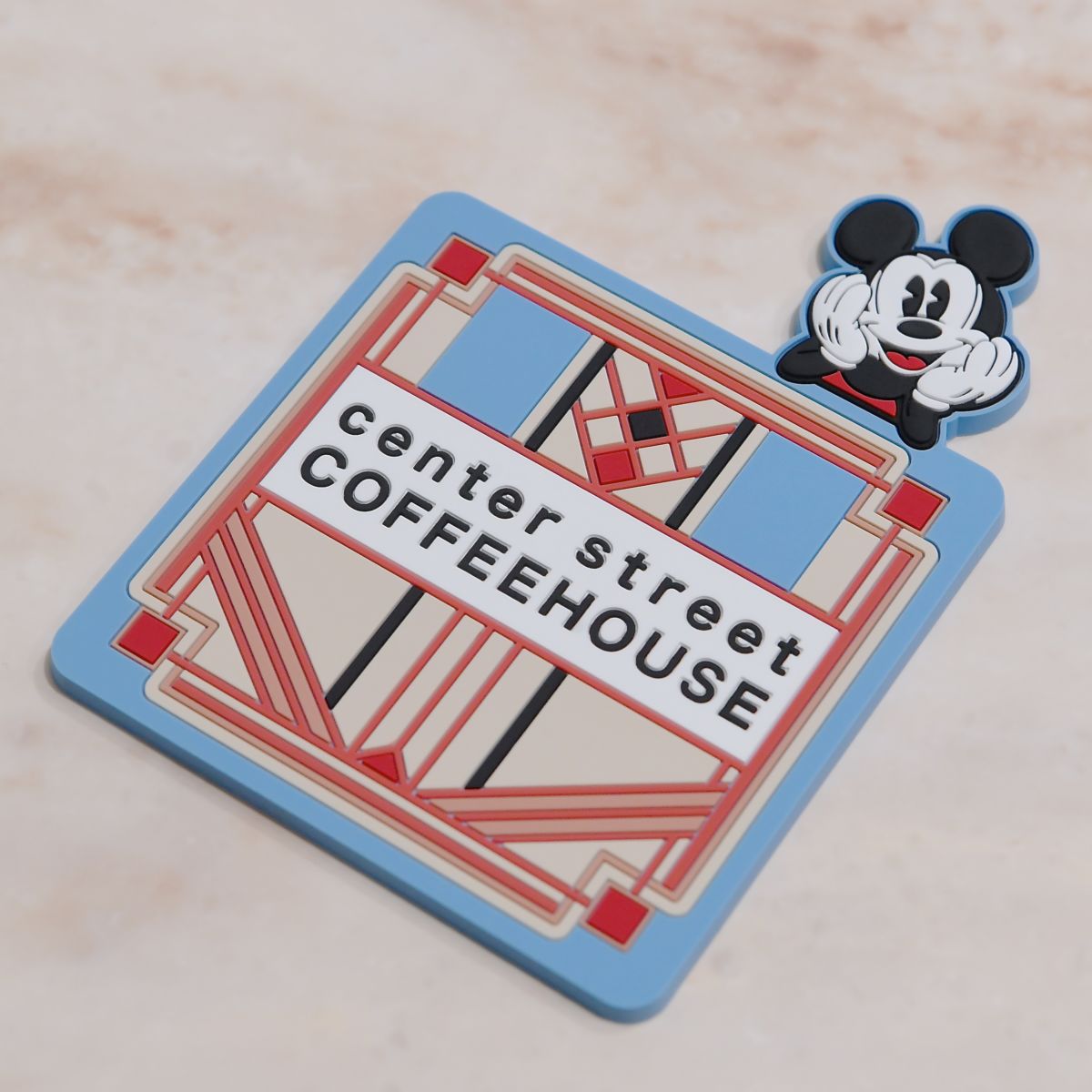 センターストリートコーヒーハウスのロゴとミッキーマウスがデザインされたスーベニアコースター。