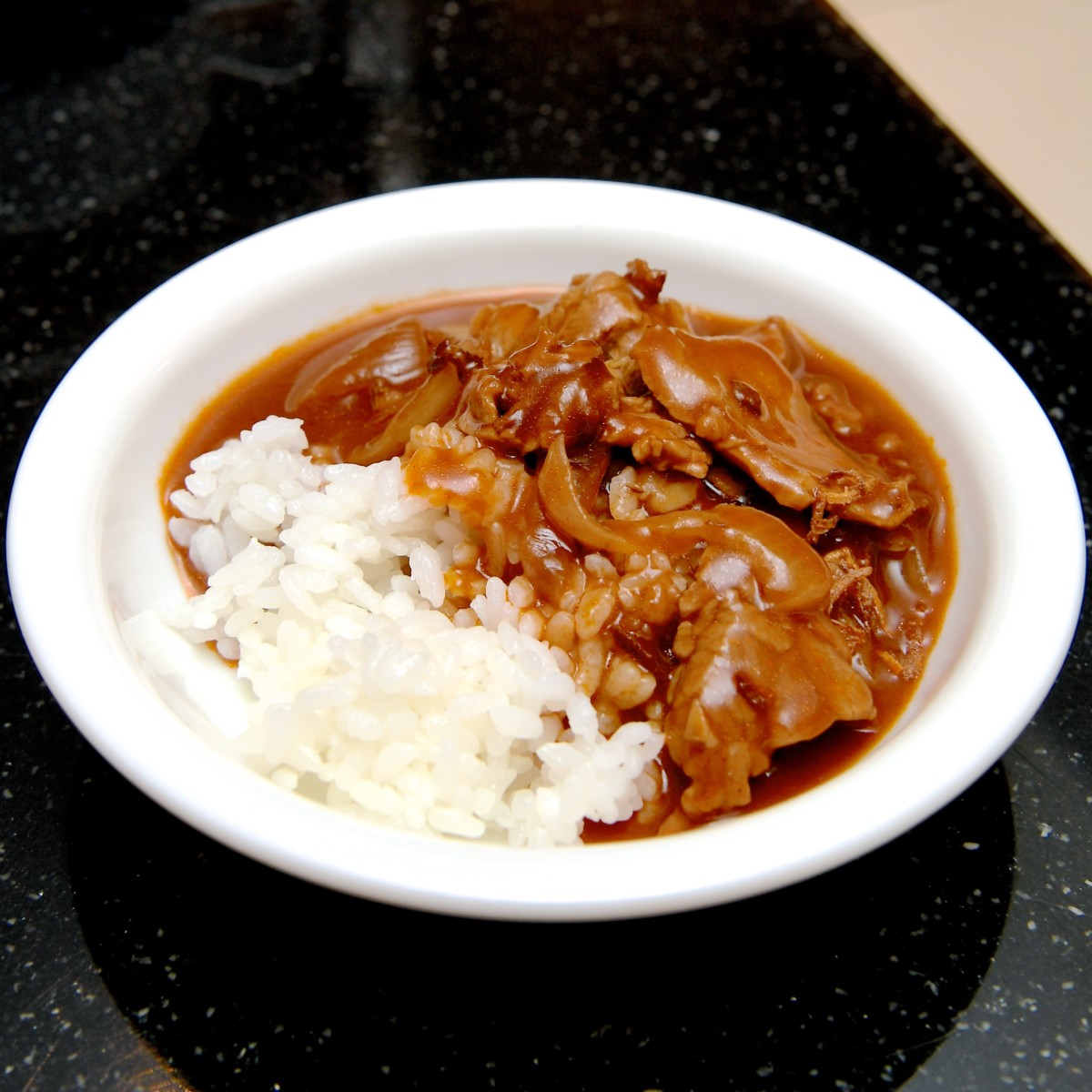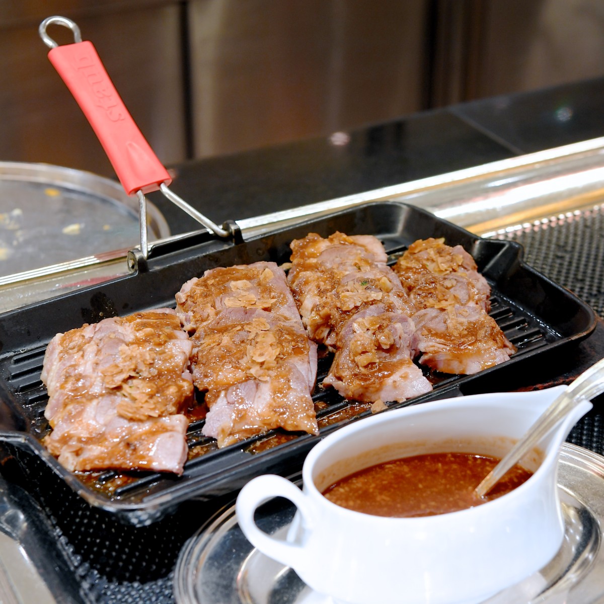 しっかりした味わいの豚タンのグリルと梨のコンポート。