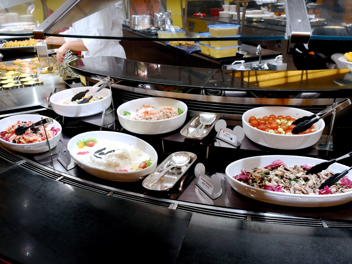 サラダ類は、ガーデンサラダ、ベジタブルスライス、きゅうり、チェリートマト、コーン、海藻サラダ。