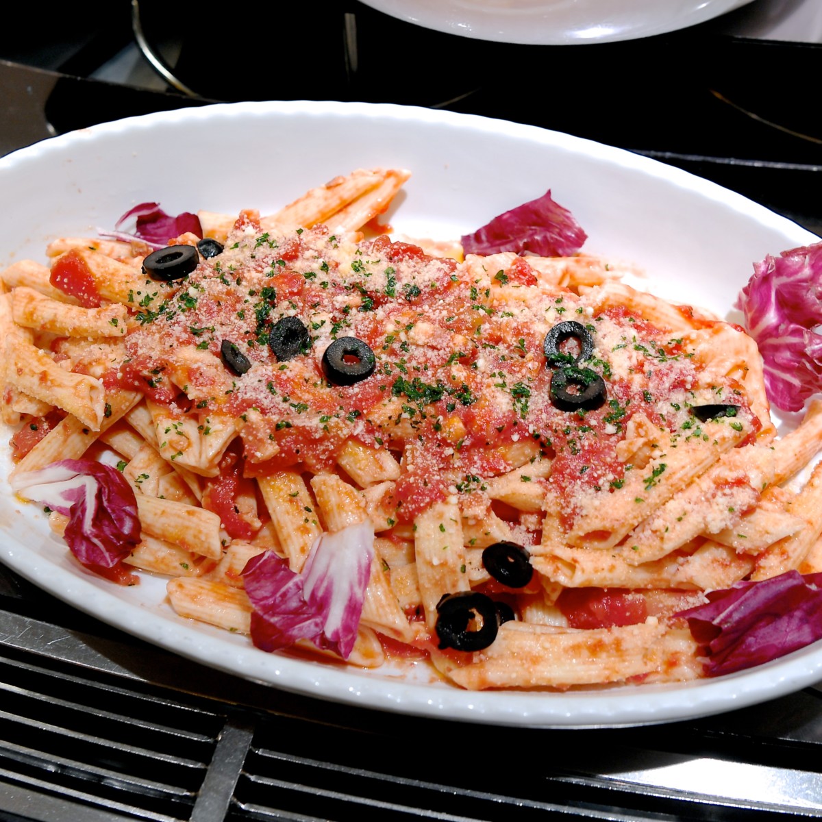 ペンネはトマト、ベーコン、チーズ、黒オリーブたっぷりなアマトリチャーナで。