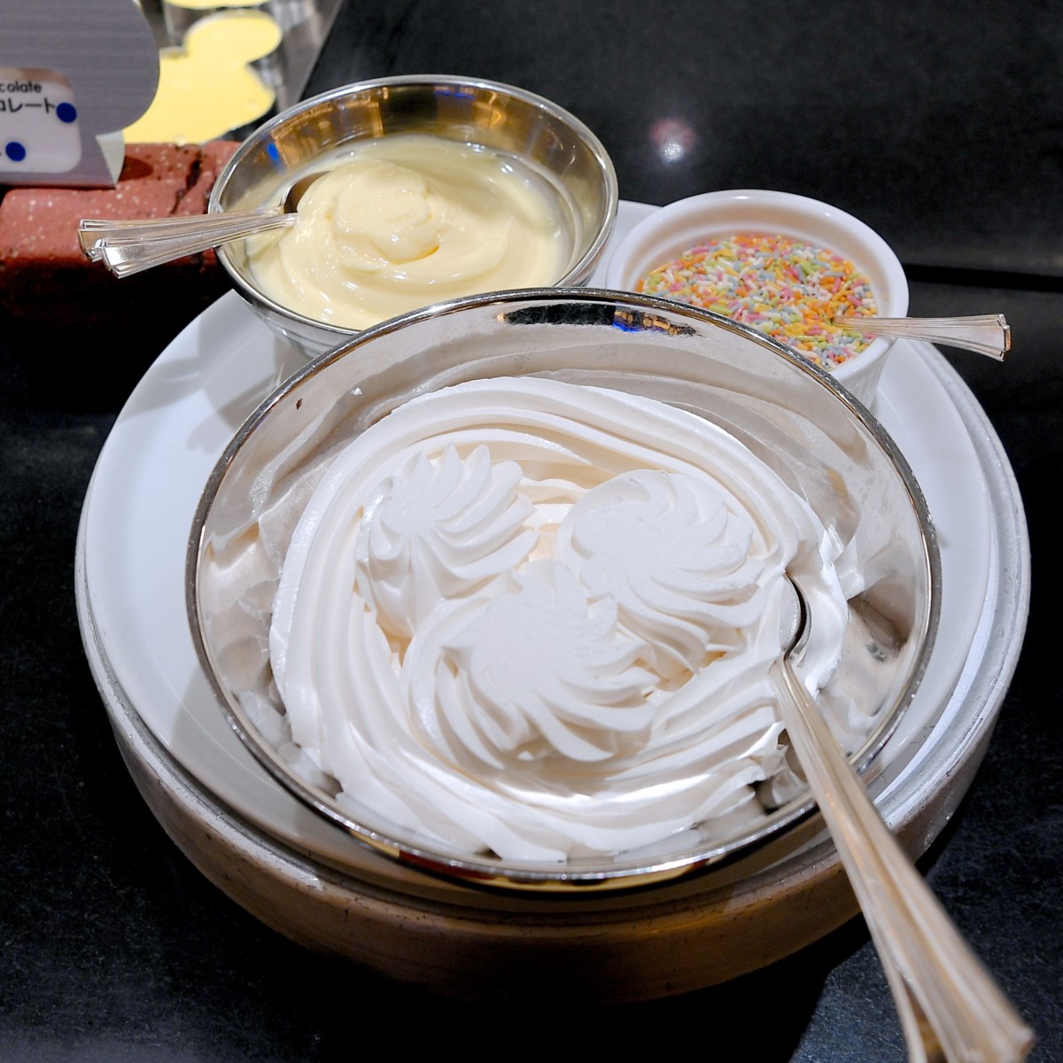ベリーソース、シロップ、オレンジカラメルソース、チョコレートソースをお好みでトッピングしていただきます。