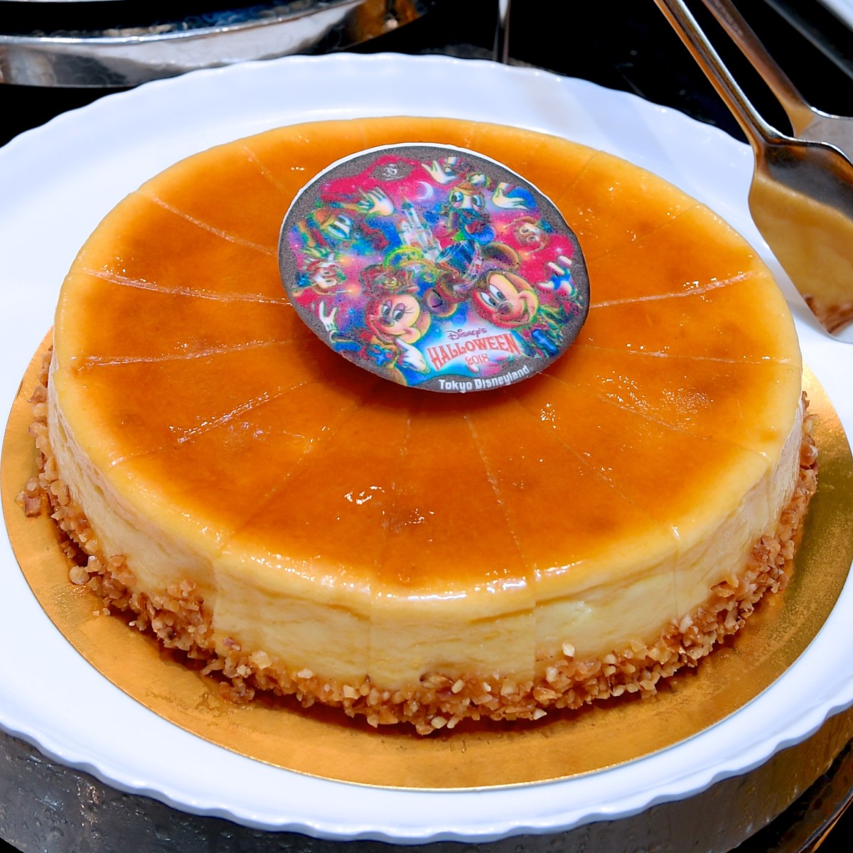 『スプーキー“Boo!”パレード』のゴーストになったミッキー、ミニー、ドナルド、デイジー、チップ、デールがデザインされた砂糖菓子がデコレーションされたスフレチーズケーキ。