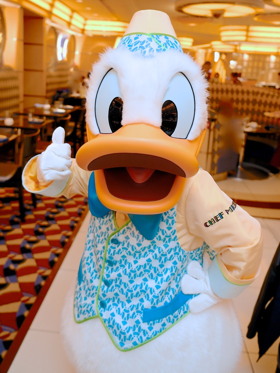 元気いっぱいなドナルドはシャツとベスト、蝶ネクタイのかわいいコスチューム。