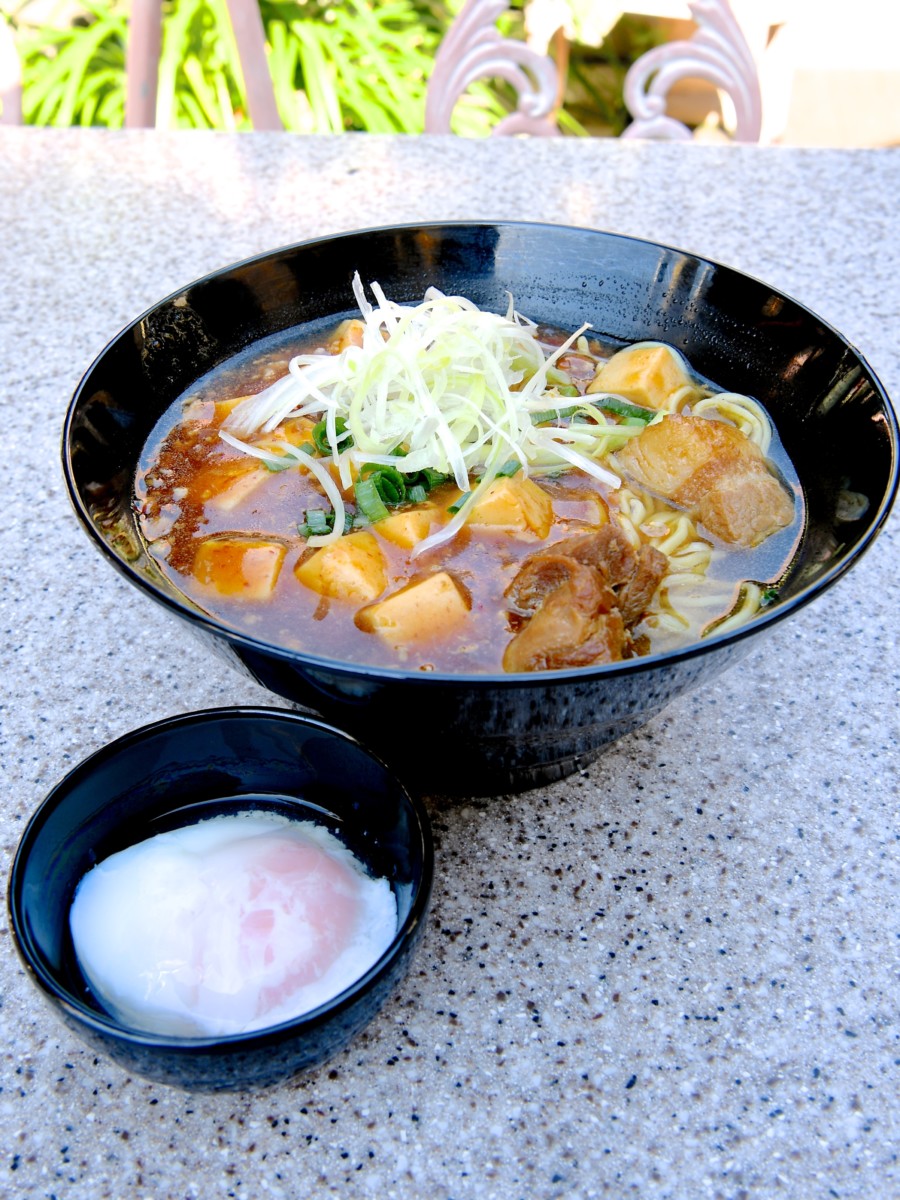 豚角煮とマーボー豆腐のあんかけ麺、半熟玉子添え