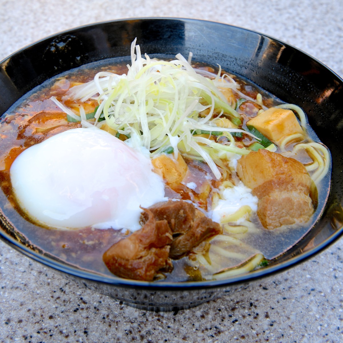 豚角煮とマーボー豆腐のあんかけ麺、半熟玉子添え アップ