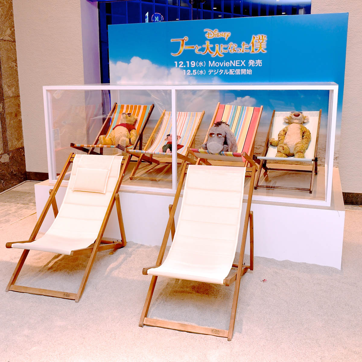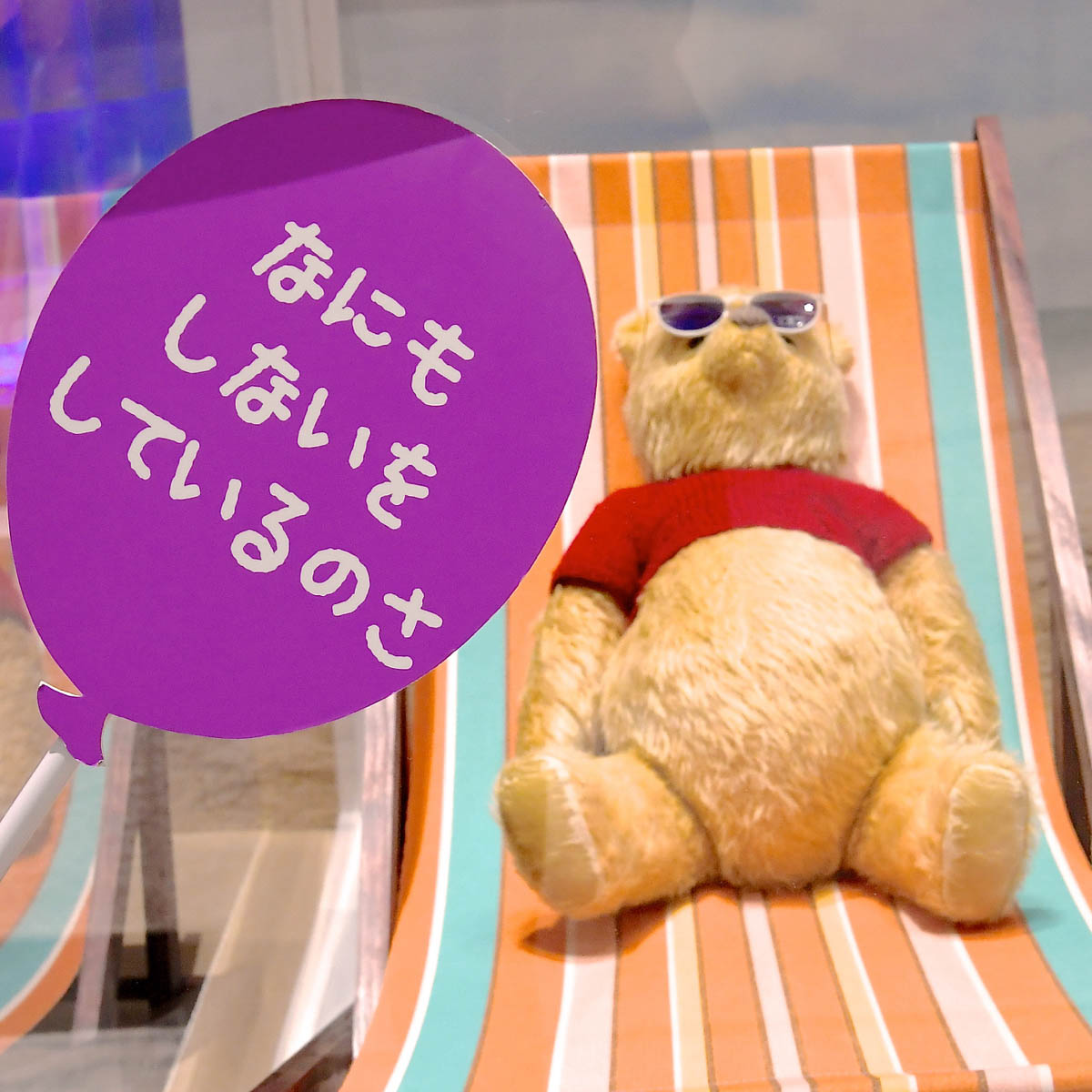 「プー」と仲間たちがビーチでくつろぎながら“なんにもしない”様子が再現されたかわいいフォトスポット。