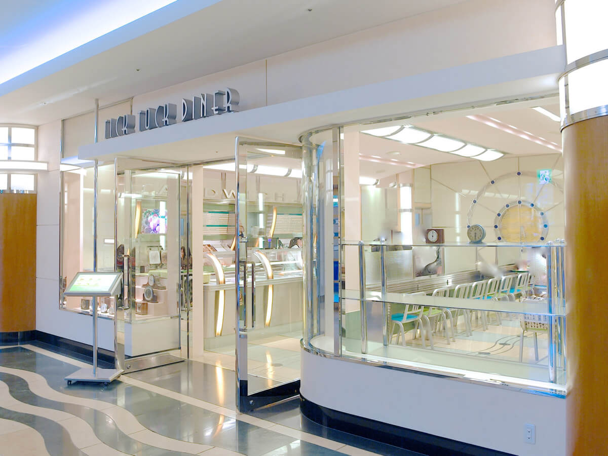 1950年代のポップなダイナーをイメージした、大きな時計が特徴のデリカフェです。