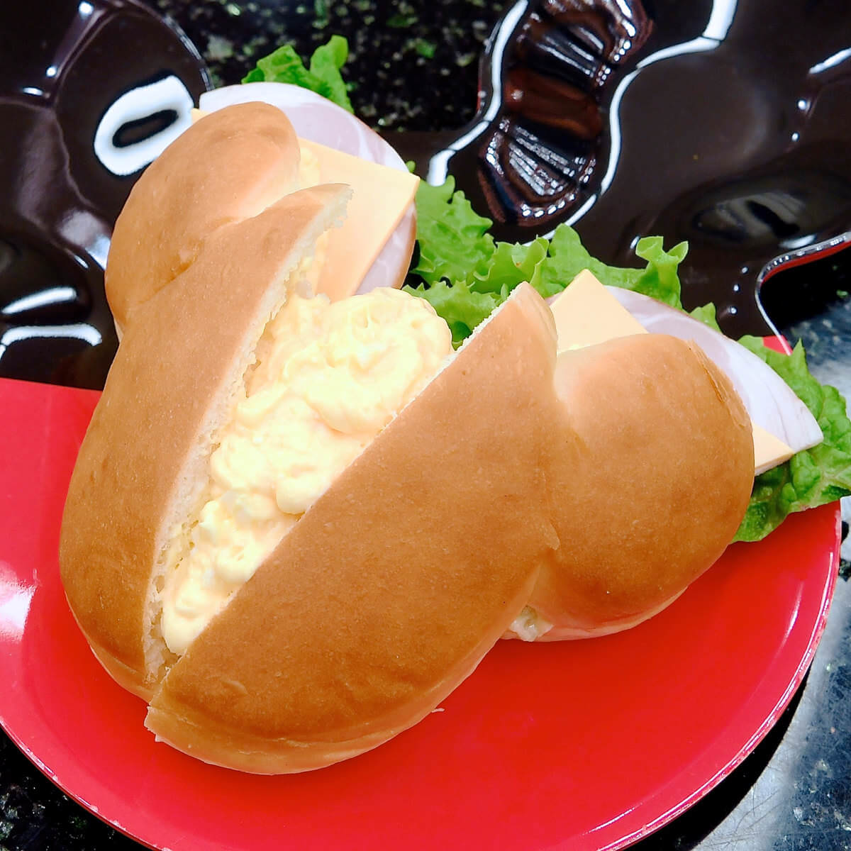 ミッキーシェイプのパンにタマゴとハム、チーズ、レタスをサンドしたサンドウィッチ。