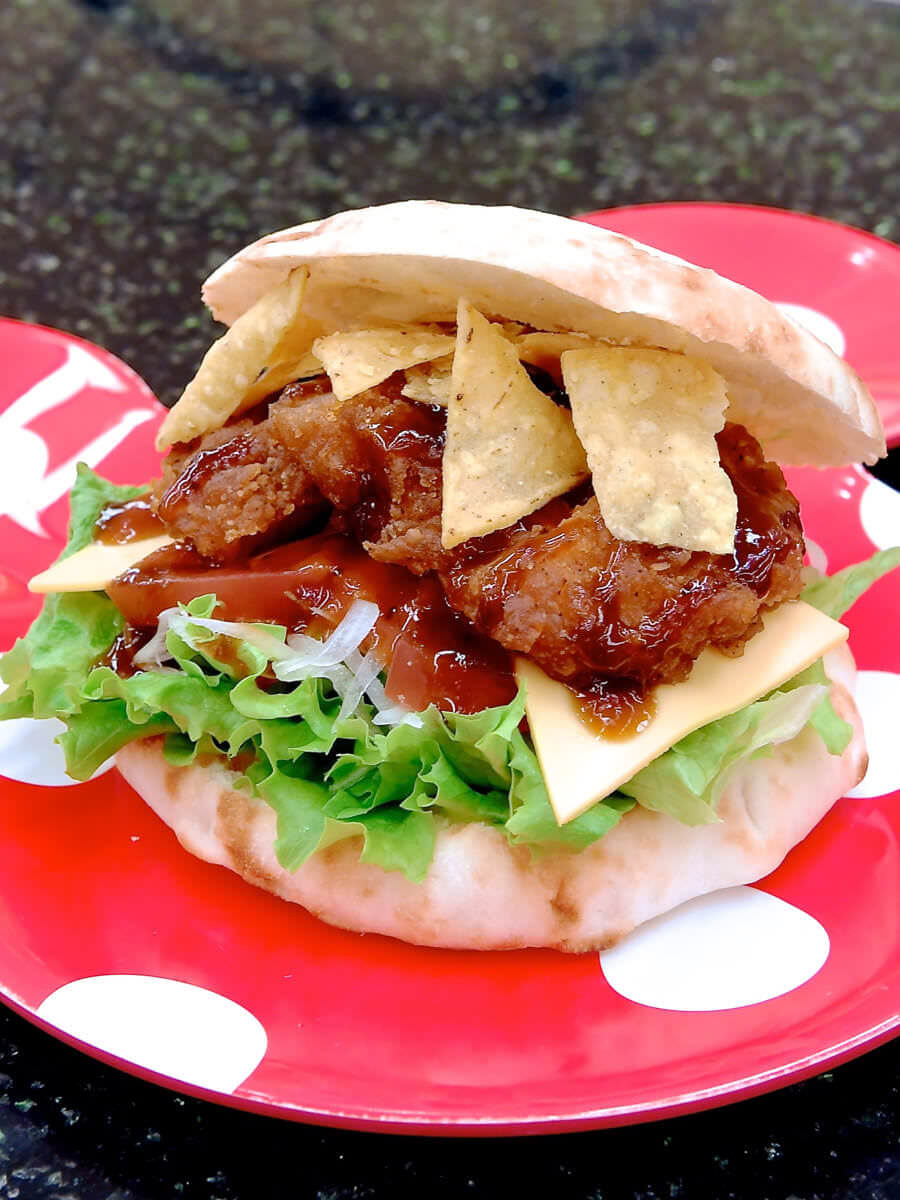 テリヤキソースのかかったフライドチキンとガーリックトルティーヤチップス、トマトやレタスなどの野菜がサンドされたメニュー。