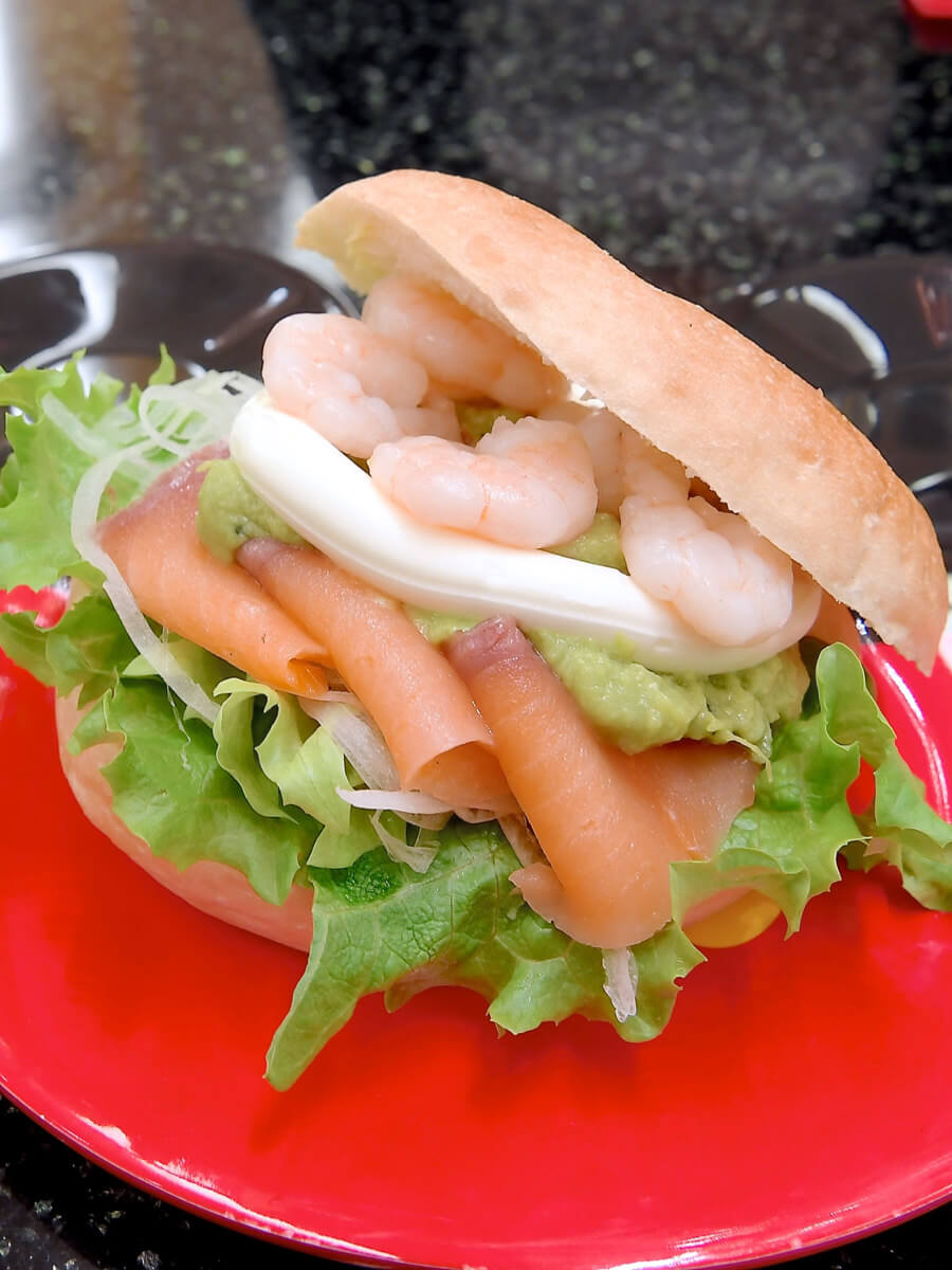 スモークサーモンとエビ、クリームチーズがサンドされたヘルシーなメニューです☆