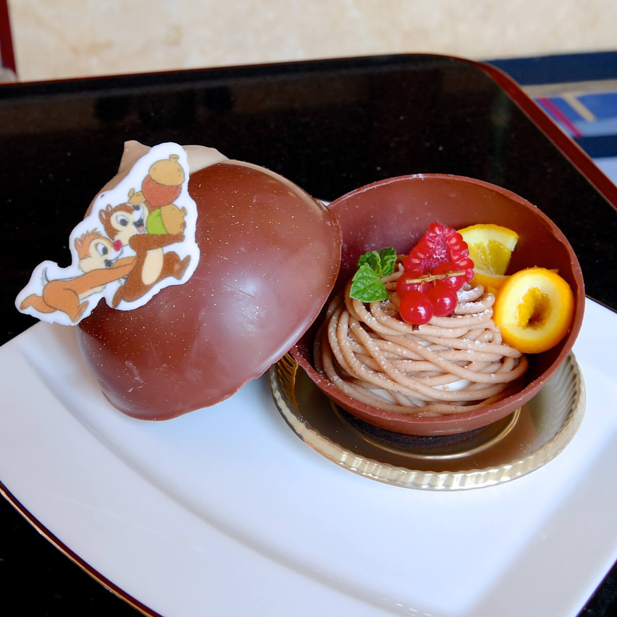 チョコレートの器を開くとフルーツがトッピングされたモンブランが登場!