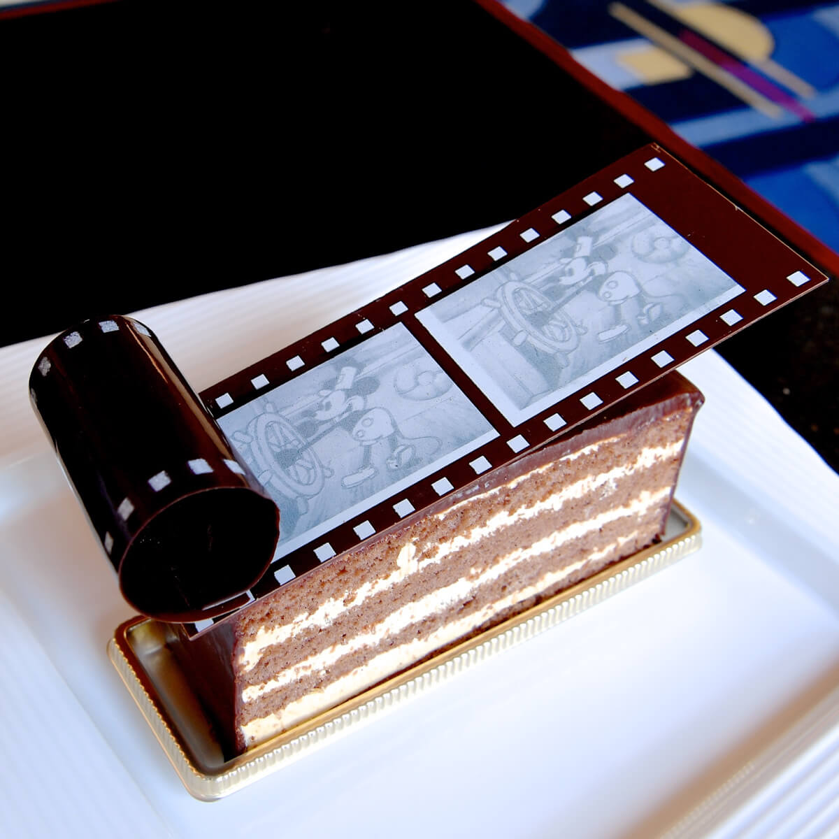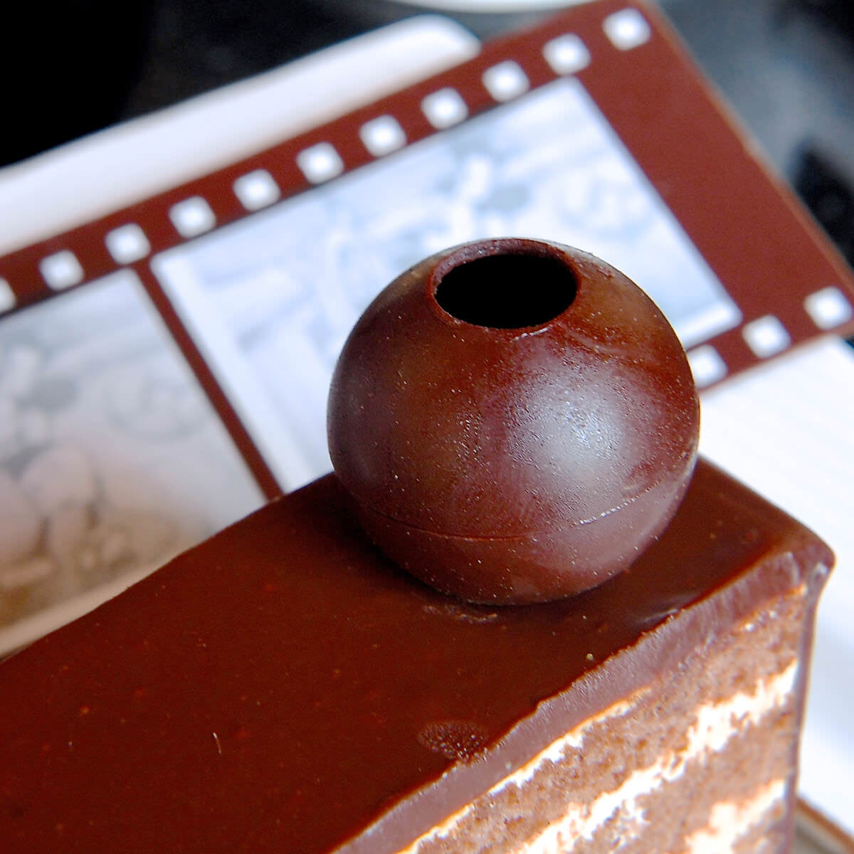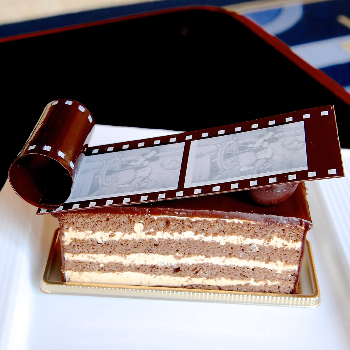 映画のフィルムをモチーフにしたチョコレート細工がトッピングされたおしゃれなケーキです。