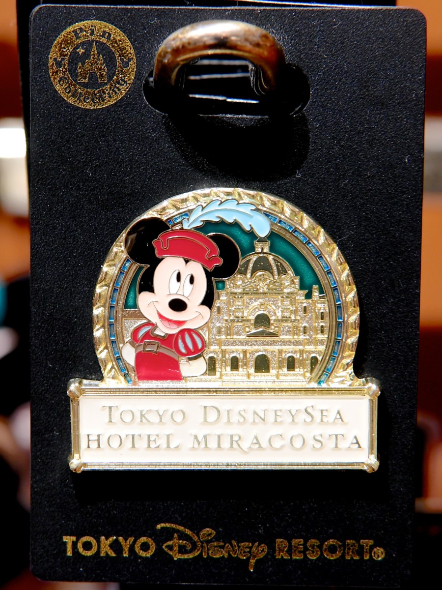 東京ディズニーシーホテル・ミラコスタは大航海時代を思わせる豪華なえんじ色のコスチュームを着たミッキーのピンバッジ。