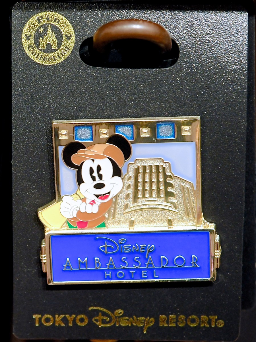 ディズニーアンバサダーホテルはアールデコなホテルの雰囲気に合った映画監督姿のミッキーのピンバッジ。