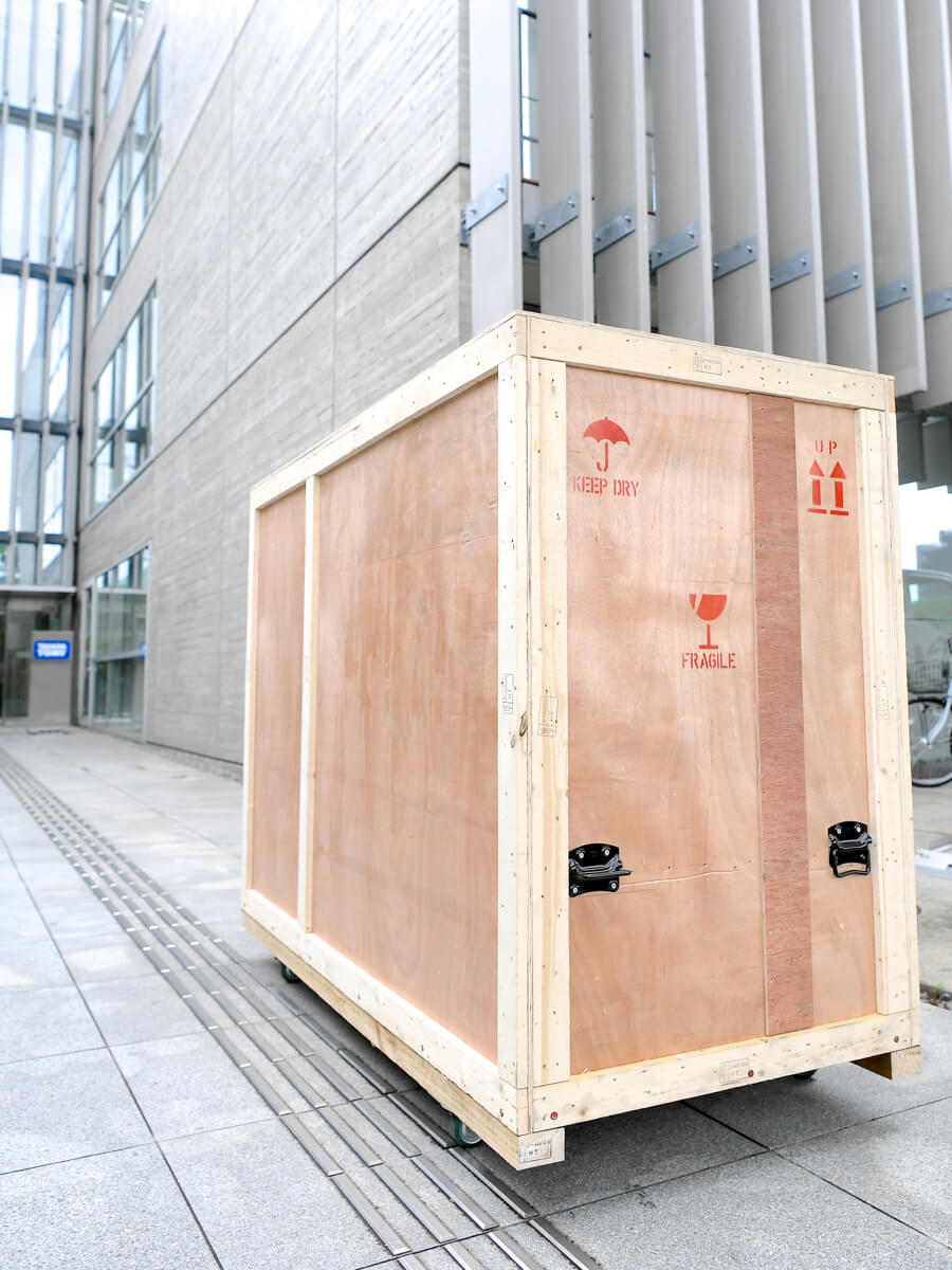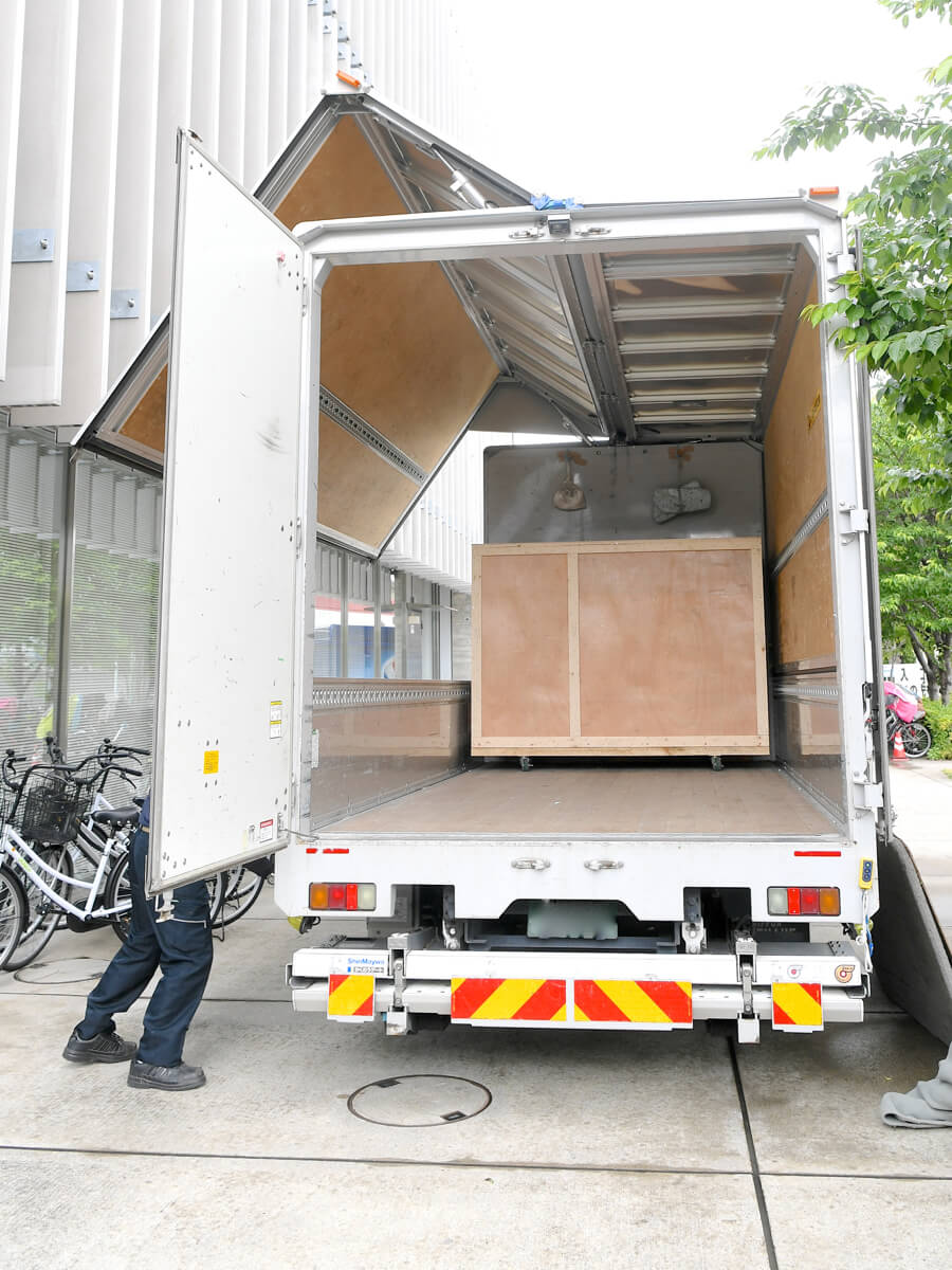 トラックの扉を開くと、大きな木箱が登場☆