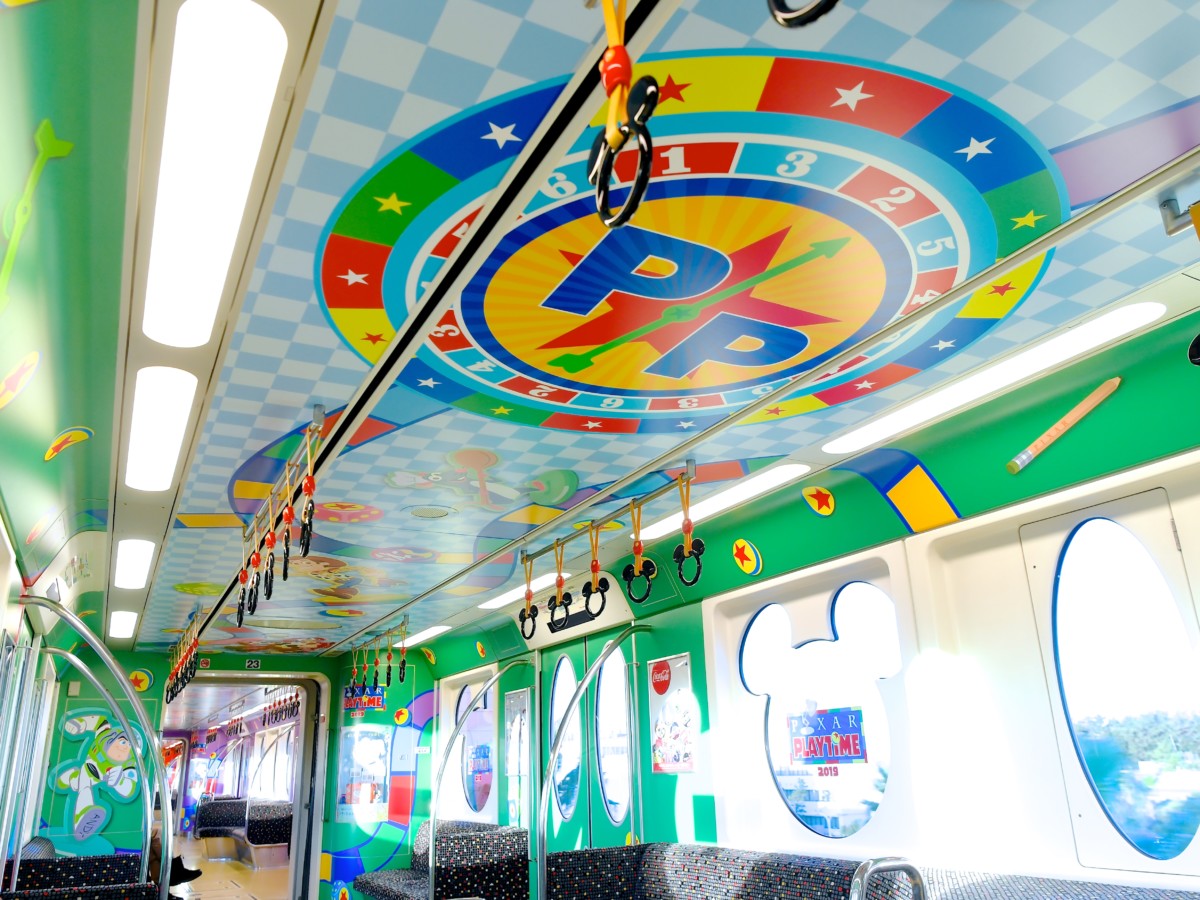 期間限定運行される“ピクサー・プレイタイム2019”のラッピングモノレール。