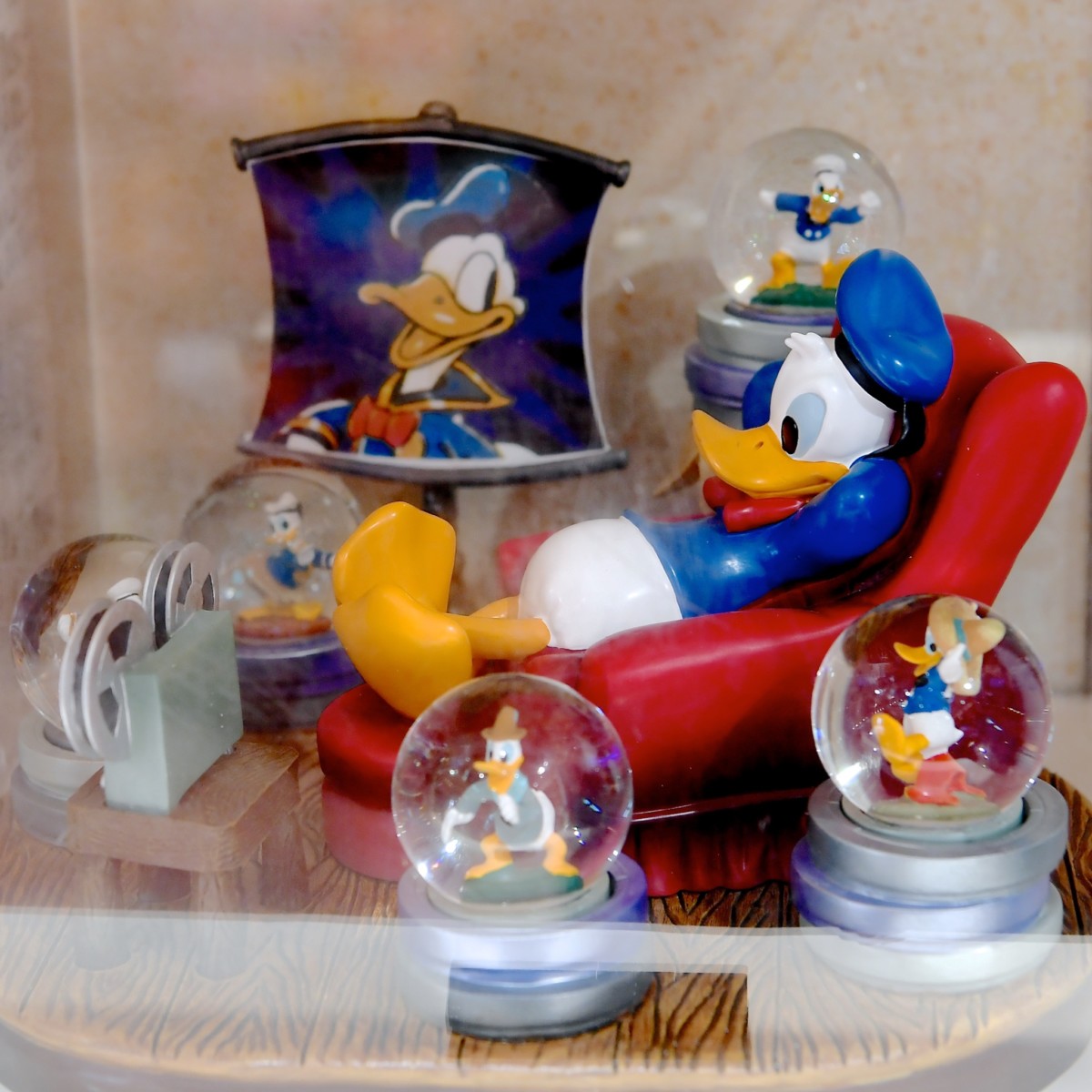 ドームの中には、ドナルドがこれまで登場してきたたくさんの作品の自分の姿を眺めるソファーに座ったドナルドが☆