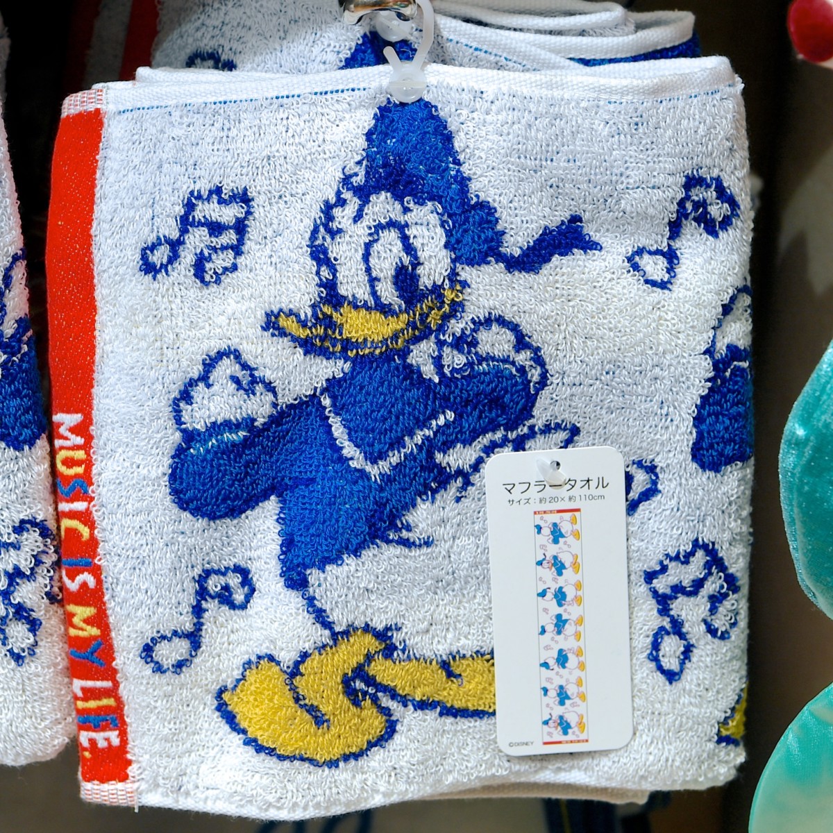 リズムに合わせておしりをふりふりするドナルドがデザインされた長めのタオルマフラー。