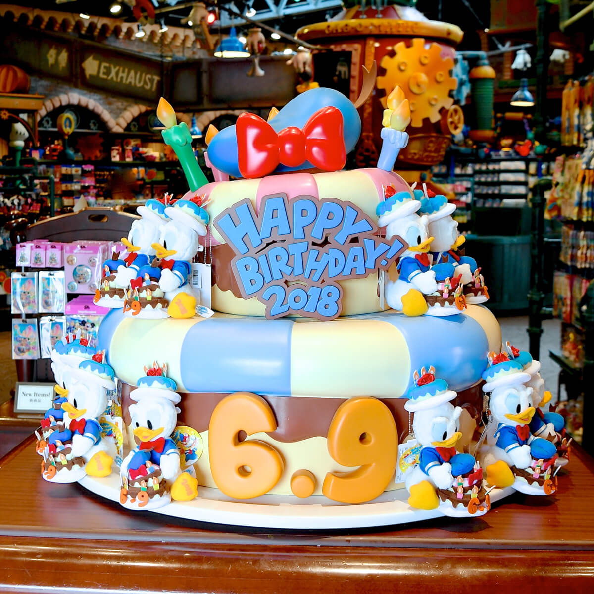 トゥーンタウンにあるショップ「ギャグファクトリー/ファイブ・アンド・ダイム」では、ドナルドのお誕生日をお祝いするデコレーションが登場!