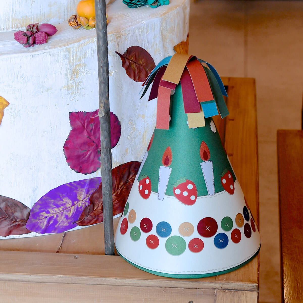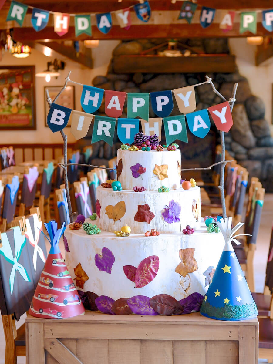 カラフルな葉っぱでかざりつけられたお誕生日ケーキ。