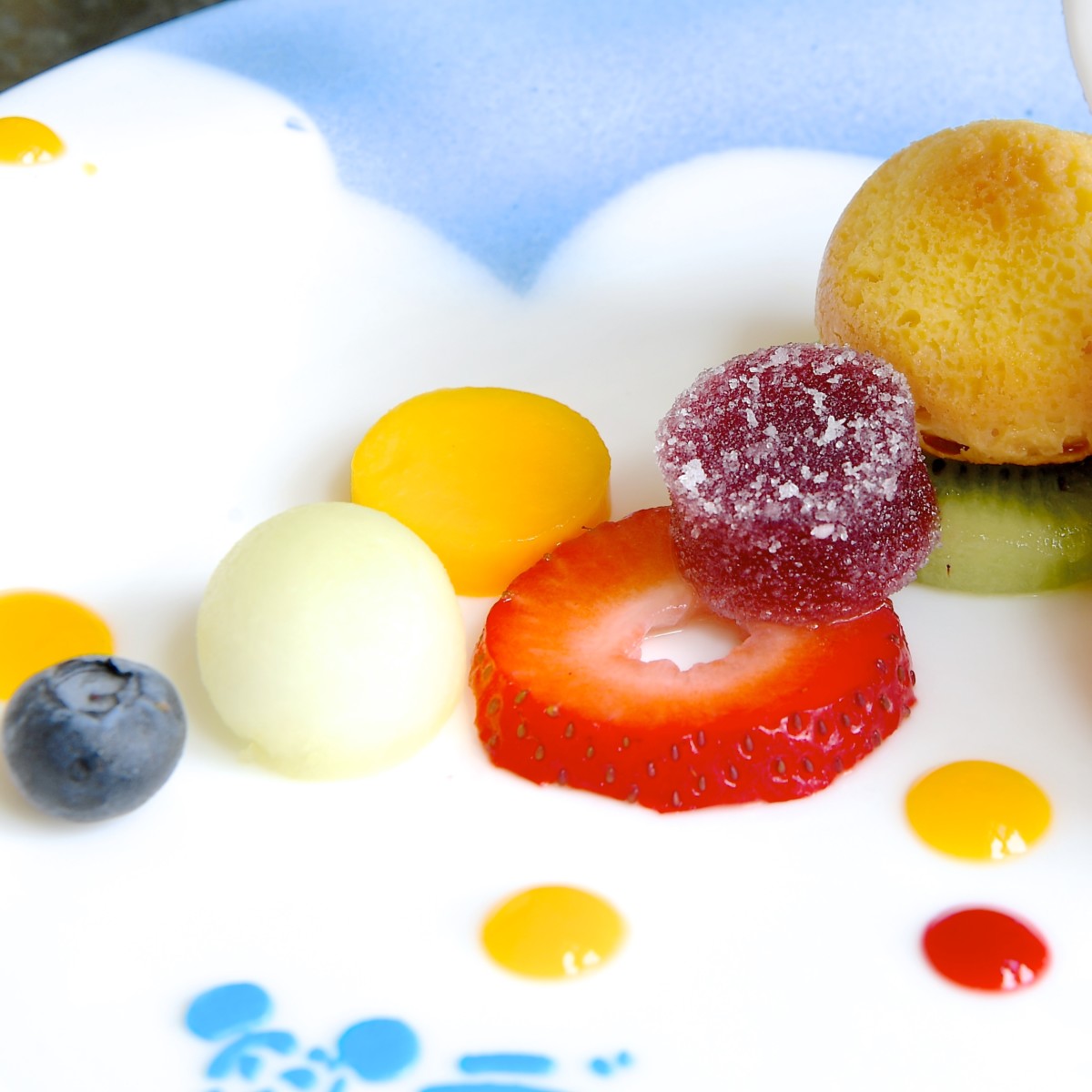 プレートには水しぶきをイメージした円形のデザートがいっぱい☆
