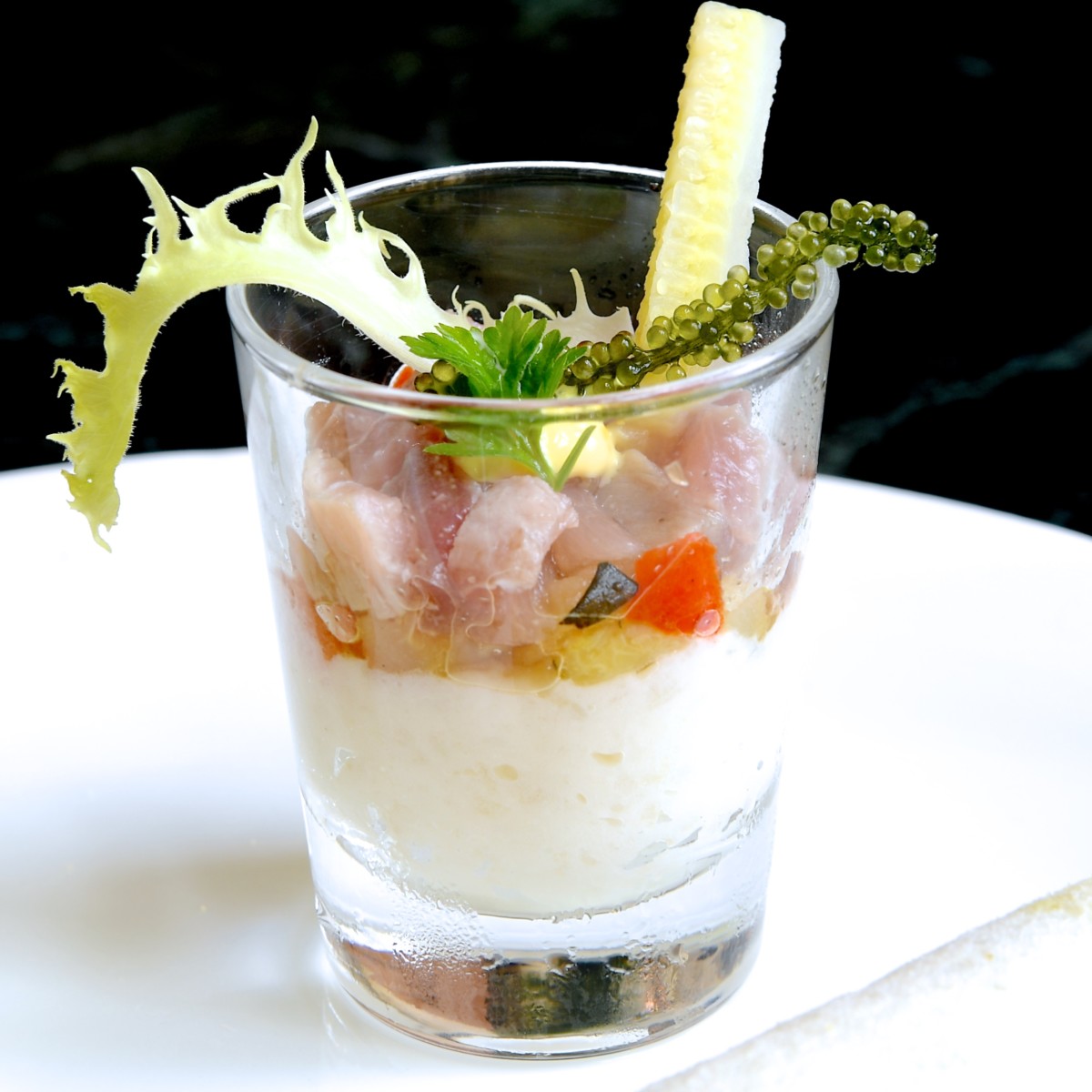 パンナコッタとトロピカルなフルーツゼリーが入ったグラスデザート。