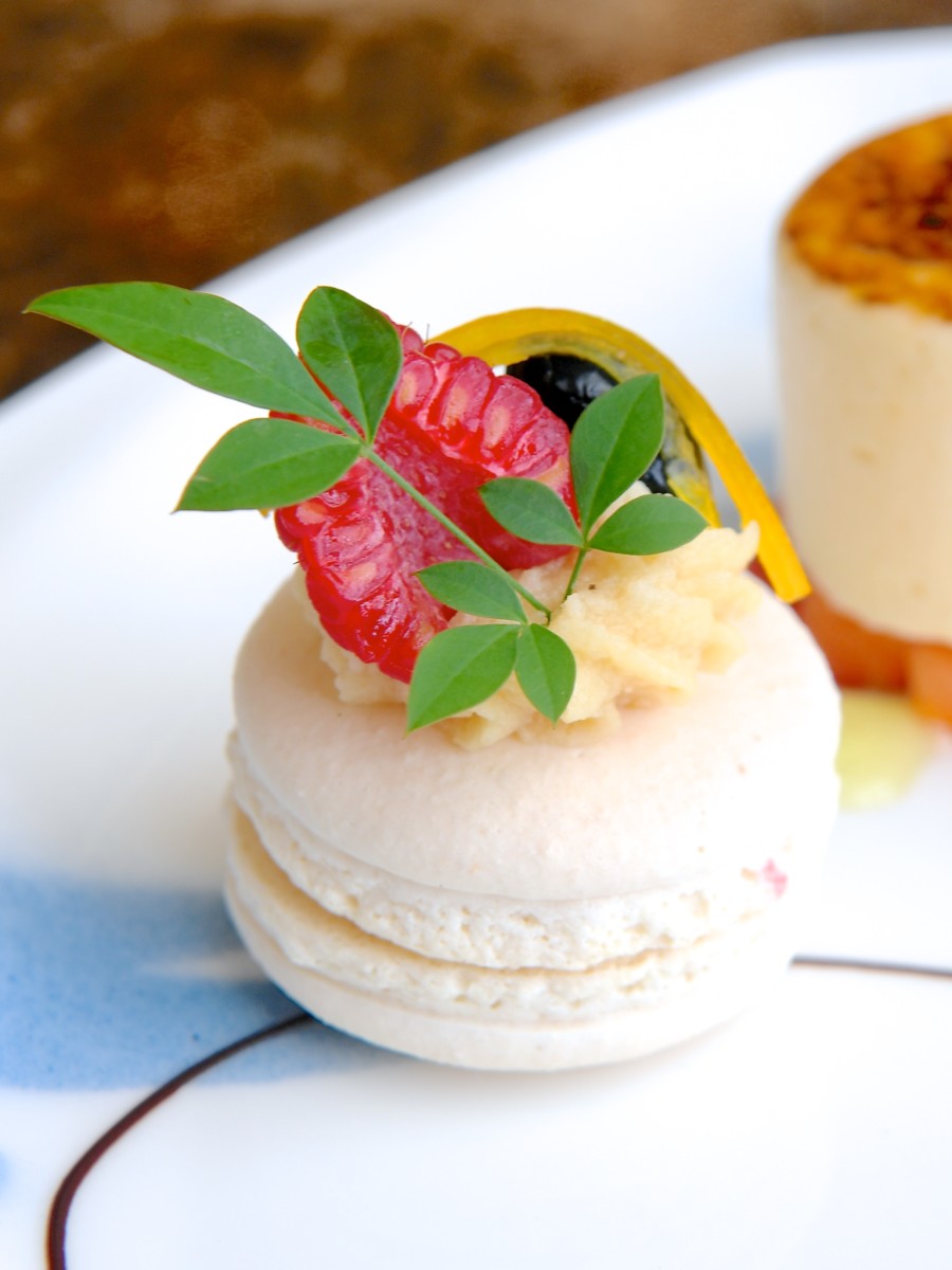 西京味噌の効いたマカロンは色鮮やかにラズベリーや黒豆、ゆずなどをトッピング。